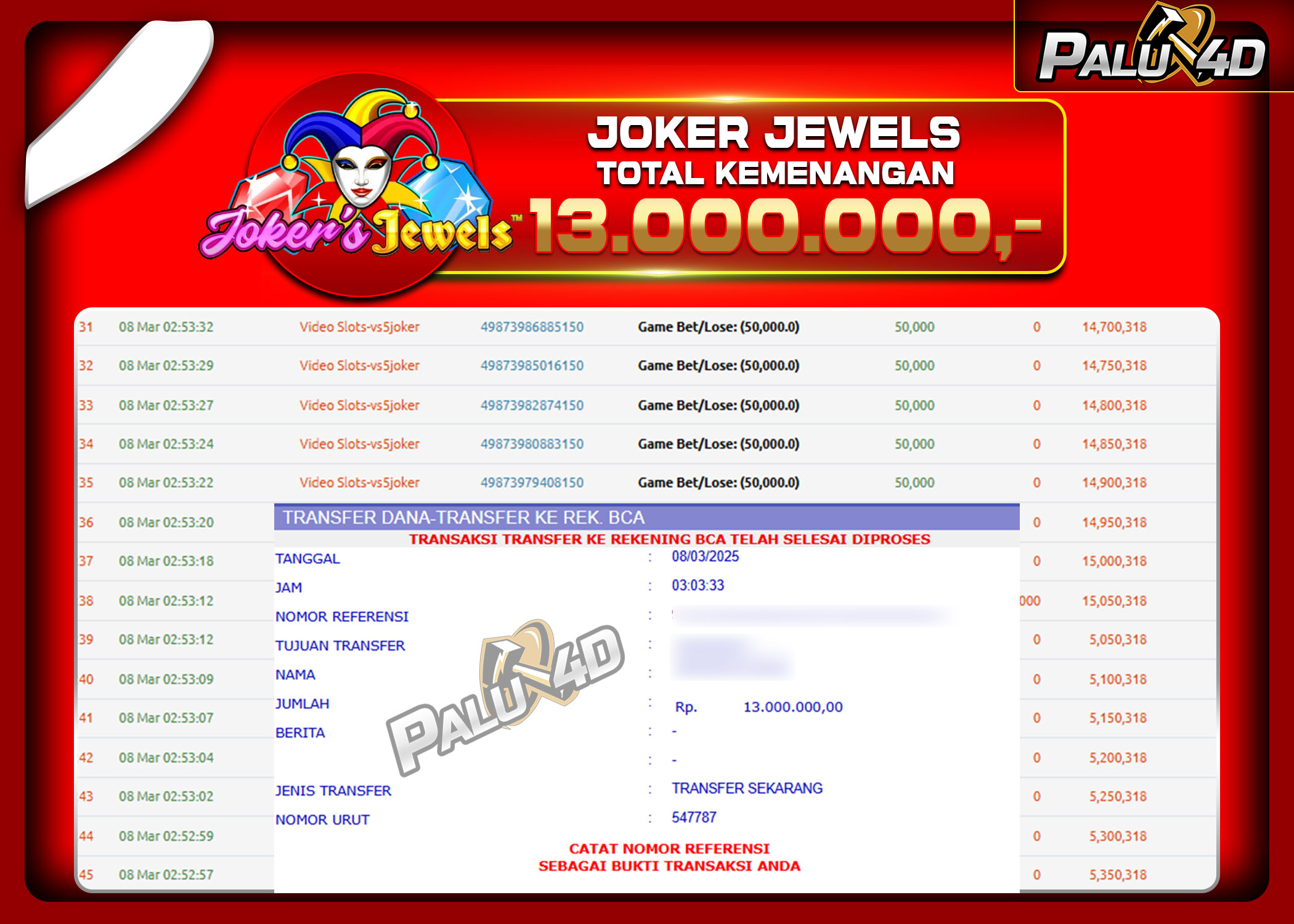 PALU4D – Selamat bagi pemenang yang mendapatkan jackpot hari ini 8 MARET 2025 di game Slot JOKER JEWELS yang di sediakan situs palu4d dan sudah kami bayar lunas. Berikut data pemenang hari ini yang kami proses dengan cepat ke rekening tujuan yang terdaftar di akun selama ±10 menit.