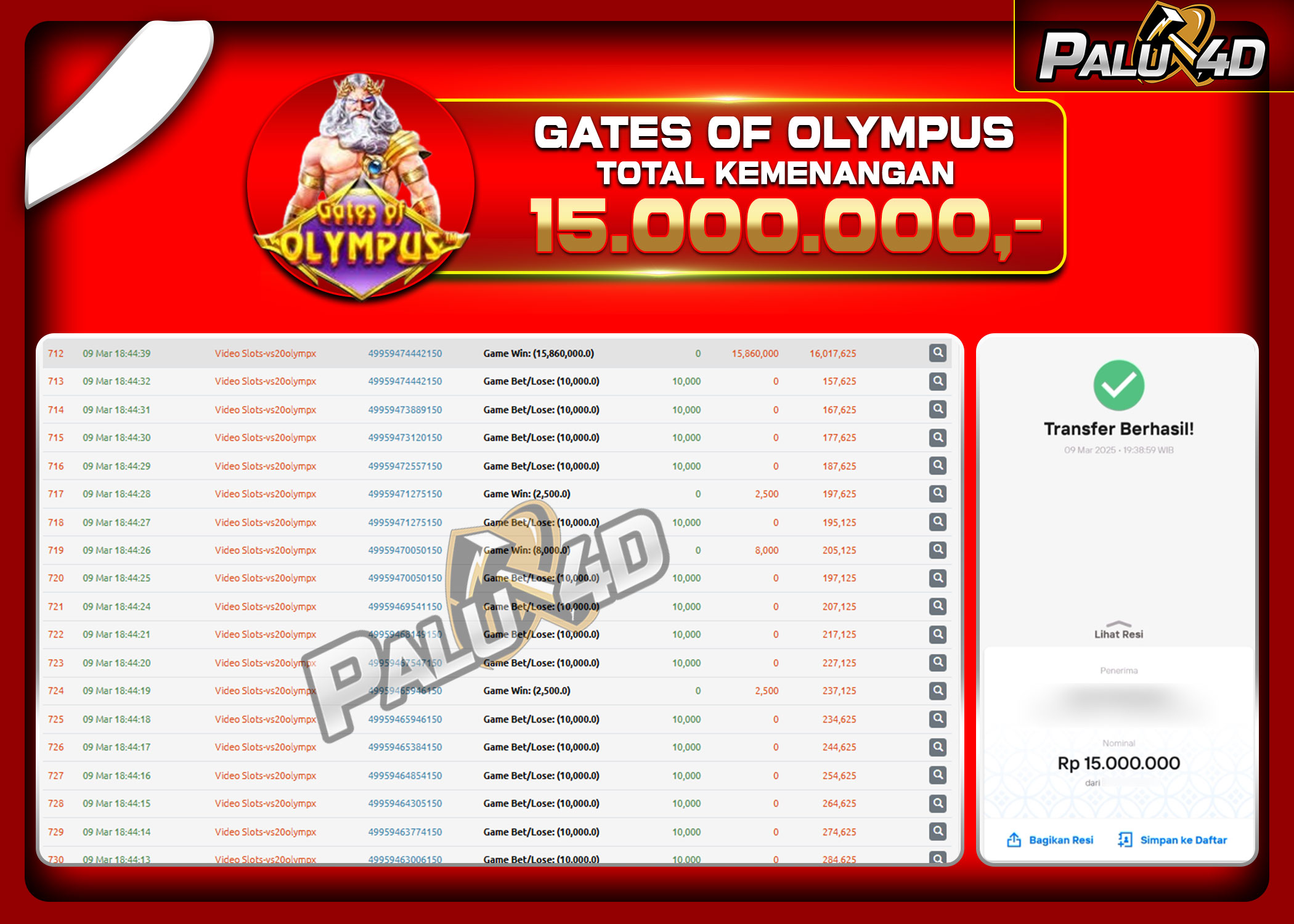 PALU4D – Selamat bagi pemenang yang mendapatkan jackpot hari ini 11 Maret 2025 di game Slot GATE OF OLYMPUS yang di sediakan situs palu4d dan sudah kami bayar lunas. Berikut data pemenang hari ini yang kami proses dengan cepat ke rekening tujuan yang terdaftar di akun selama ±10 menit.