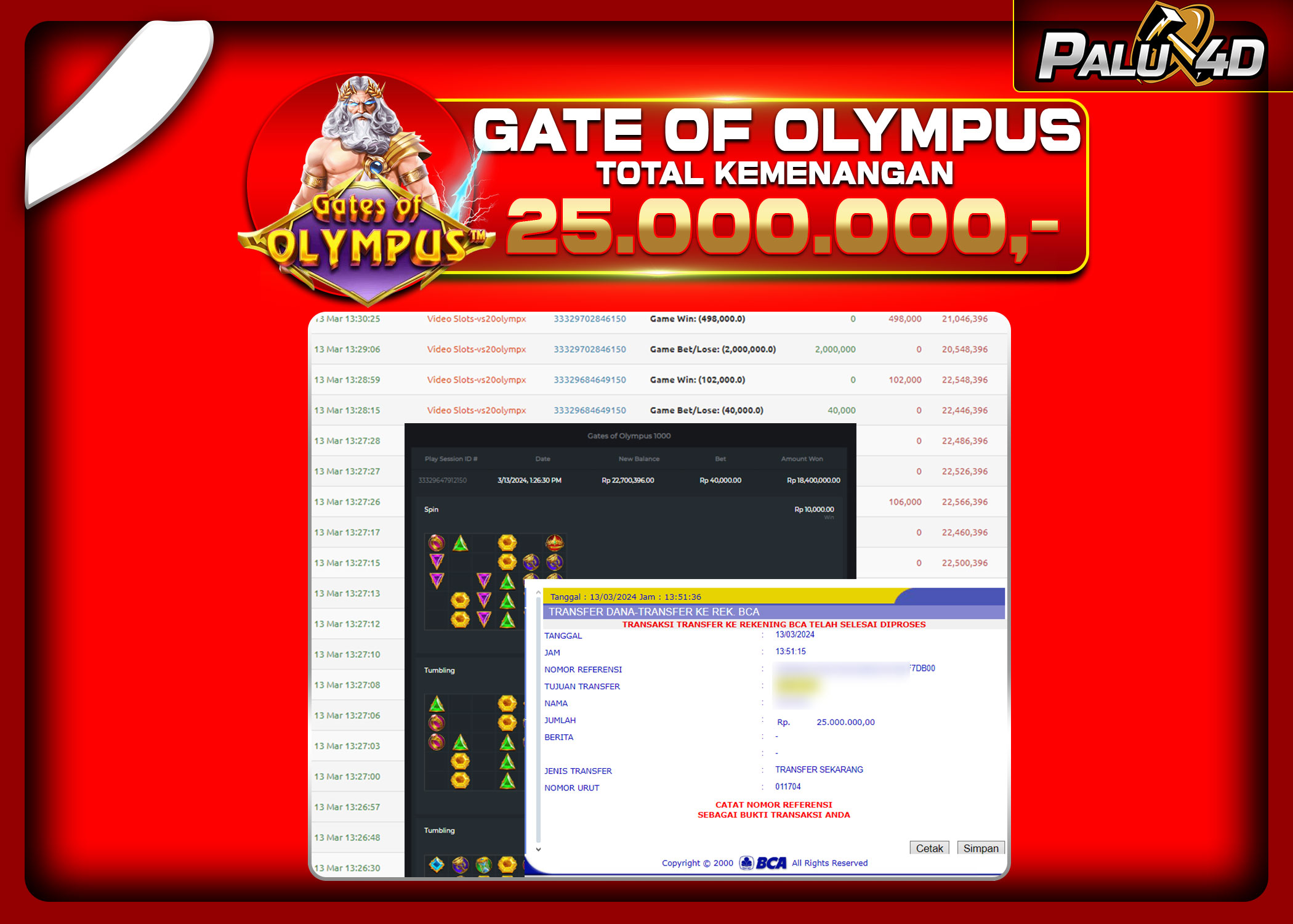 PALU4D – Selamat bagi pemenang yang mendapatkan jackpot hari ini 13 Maret 2024 di game Slot GATES OF OLYMPUS yang di sediakan situs palu4d dan sudah kami bayar lunas. Berikut data pemenang hari ini yang kami proses dengan cepat ke rekening tujuan yang terdaftar di akun selama ±10 menit.