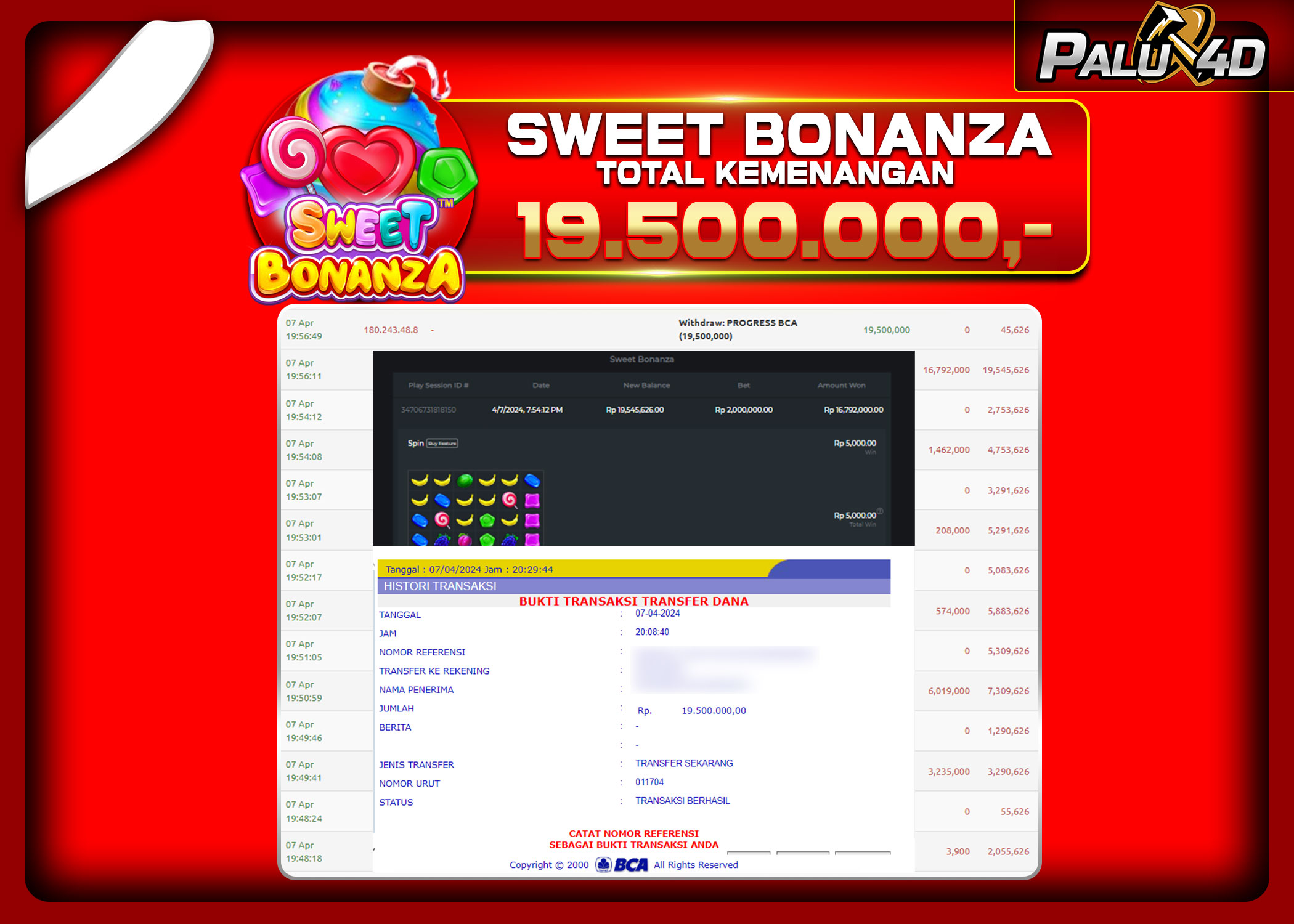 PALU4D – Selamat bagi pemenang yang mendapatkan jackpot hari ini 7 April 2024 di game Slot SWEET BONANZA   yang di sediakan situs palu4d dan sudah kami bayar lunas. Berikut data pemenang hari ini yang kami proses dengan cepat ke rekening tujuan yang terdaftar di akun selama ±10 menit.
