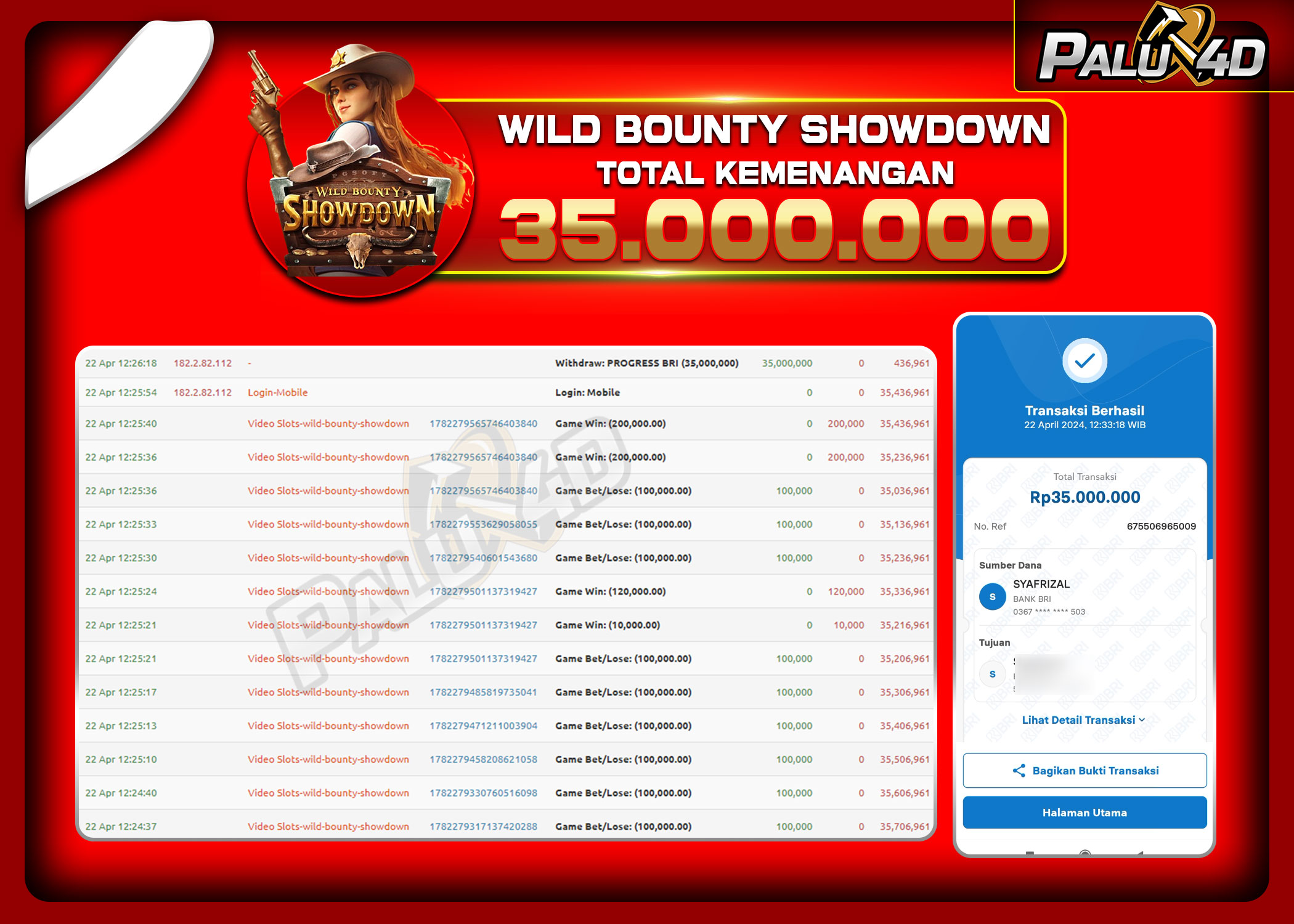 PALU4D – Selamat bagi pemenang yang mendapatkan jackpot hari ini 22 April 2024 di game Slot WILD BOUNTY SHOWDOWN yang di sediakan situs palu4d dan sudah kami bayar lunas. Berikut data pemenang hari ini yang kami proses dengan cepat ke rekening tujuan yang terdaftar di akun selama ±10 menit.