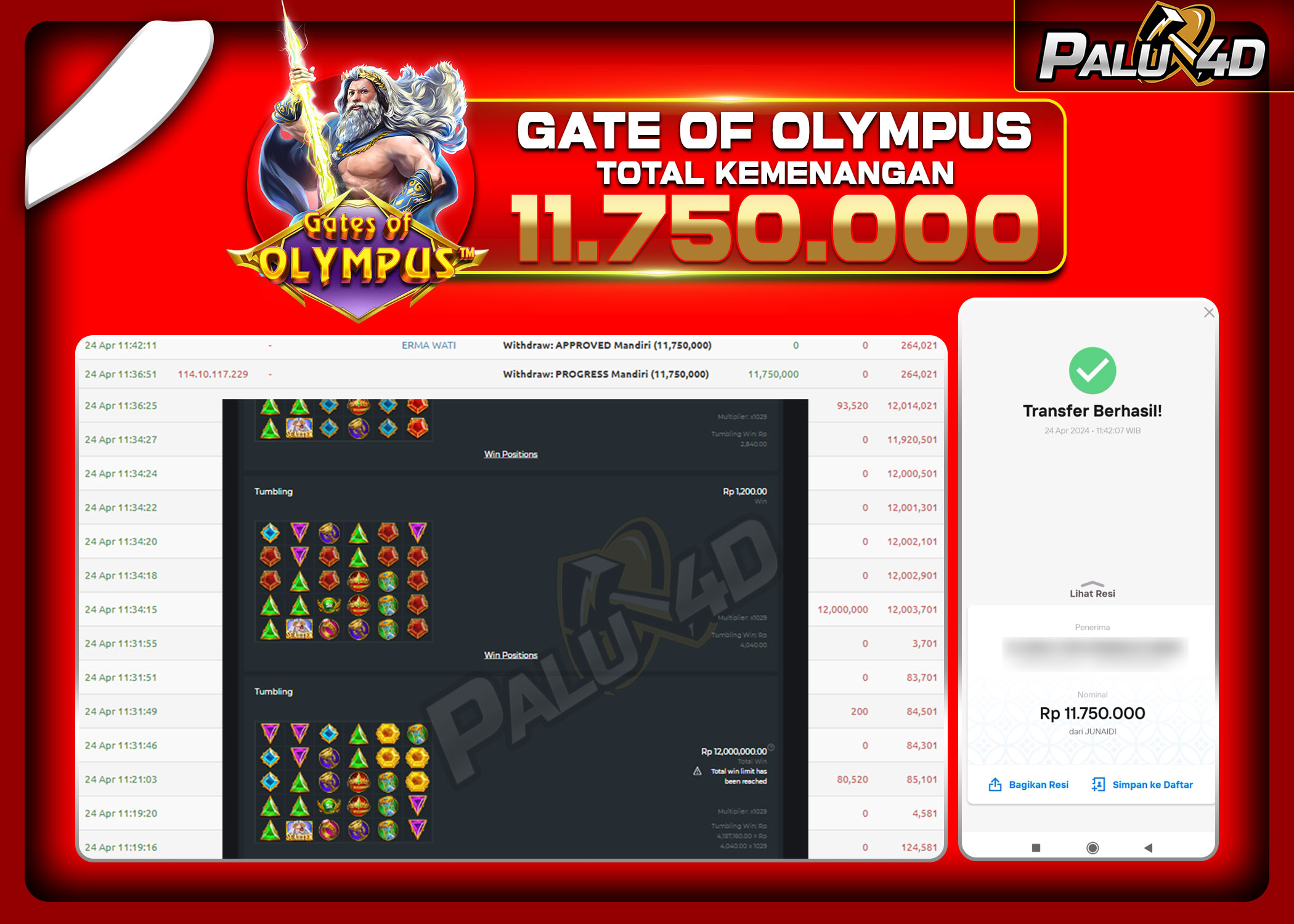 PALU4D – Selamat bagi pemenang yang mendapatkan jackpot hari ini 24 April 2024 di game Slot OLYMPUS yang di sediakan situs palu4d dan sudah kami bayar lunas. Berikut data pemenang hari ini yang kami proses dengan cepat ke rekening tujuan yang terdaftar di akun selama ±10 menit.