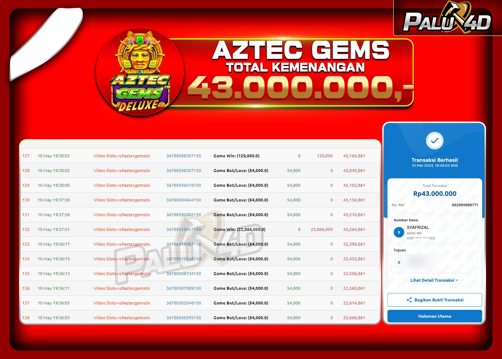 PALU4D – Selamat bagi pemenang yang mendapatkan jackpot hari ini 10 May 2024 di game Slot AZTEC GEMS yang di sediakan situs palu4d dan sudah kami bayar lunas. Berikut data pemenang hari ini yang kami proses dengan cepat ke rekening tujuan yang terdaftar di akun selama ±10 menit.