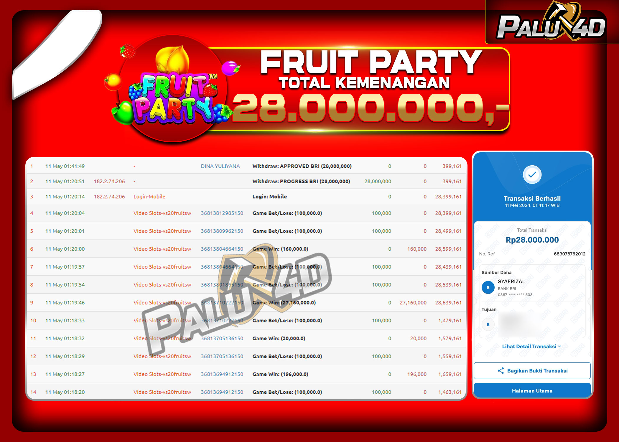 PALU4D – Selamat bagi pemenang yang mendapatkan jackpot hari ini 11 May 2024 di game Slot FRUIT PARTY  yang di sediakan situs palu4d dan sudah kami bayar lunas. Berikut data pemenang hari ini yang kami proses dengan cepat ke rekening tujuan yang terdaftar di akun selama ±10 menit.