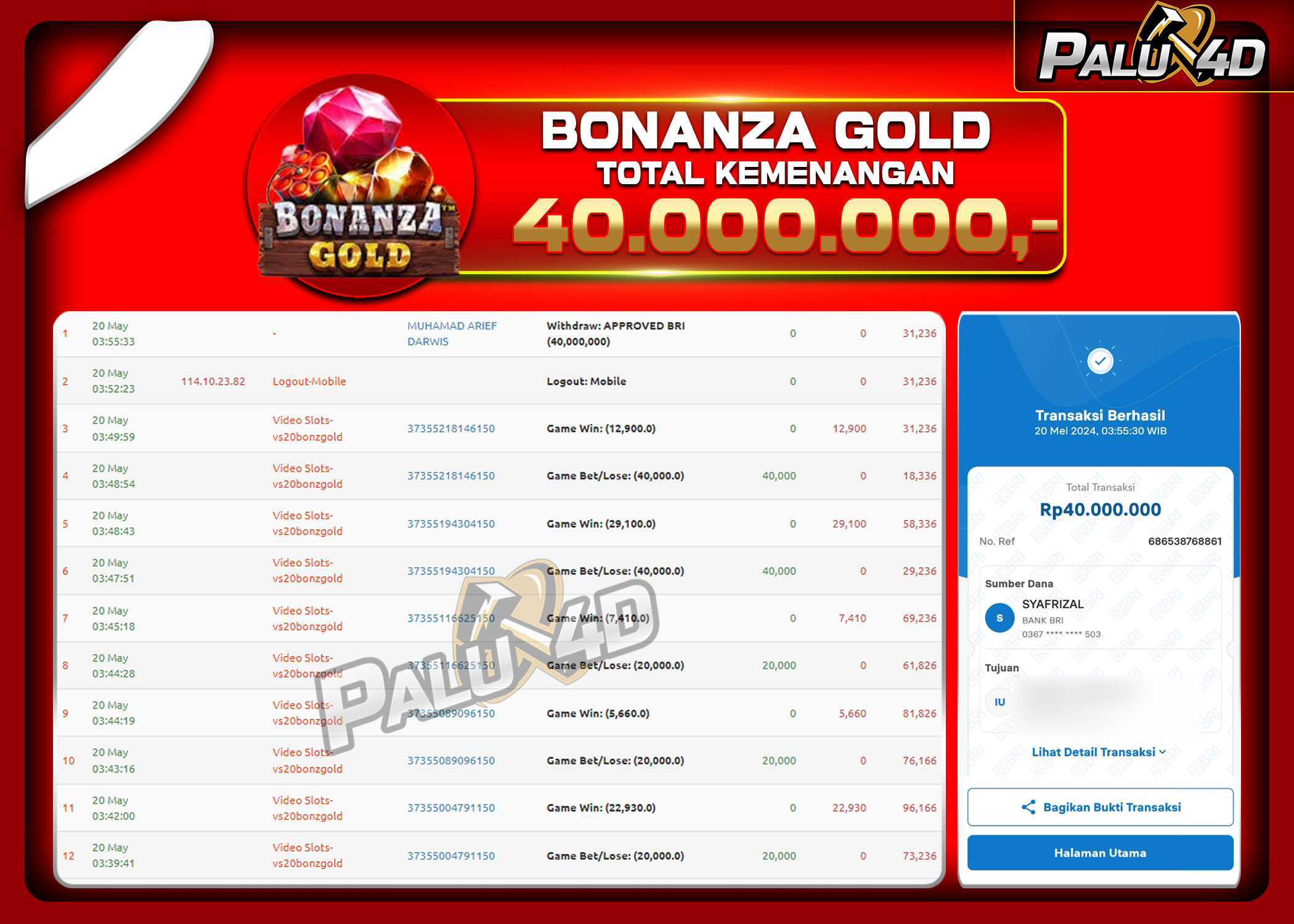 PALU4D – Menang Slot BONANZA GOLD Rp.40.000.000.,- LUNAS