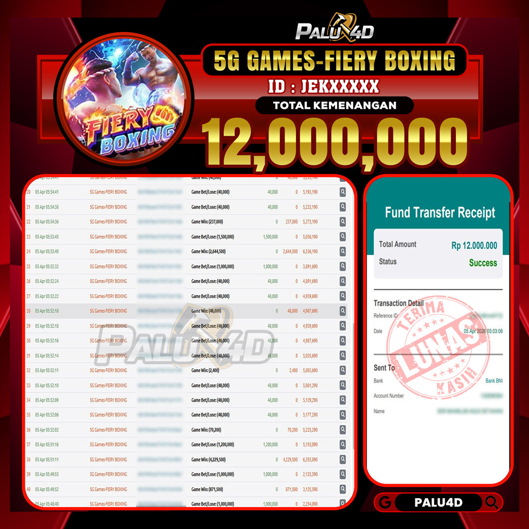PALU4D – Selamat bagi pemenang yang mendapatkan jackpot hari ini 05 APRIL 2026 di game Slot 5G GAMES-FIERY BOXING yang di sediakan situs palu4d dan sudah kami bayar lunas. Berikut data pemenang hari ini yang kami proses dengan cepat ke rekening tujuan yang terdaftar di akun selama ±10 menit.