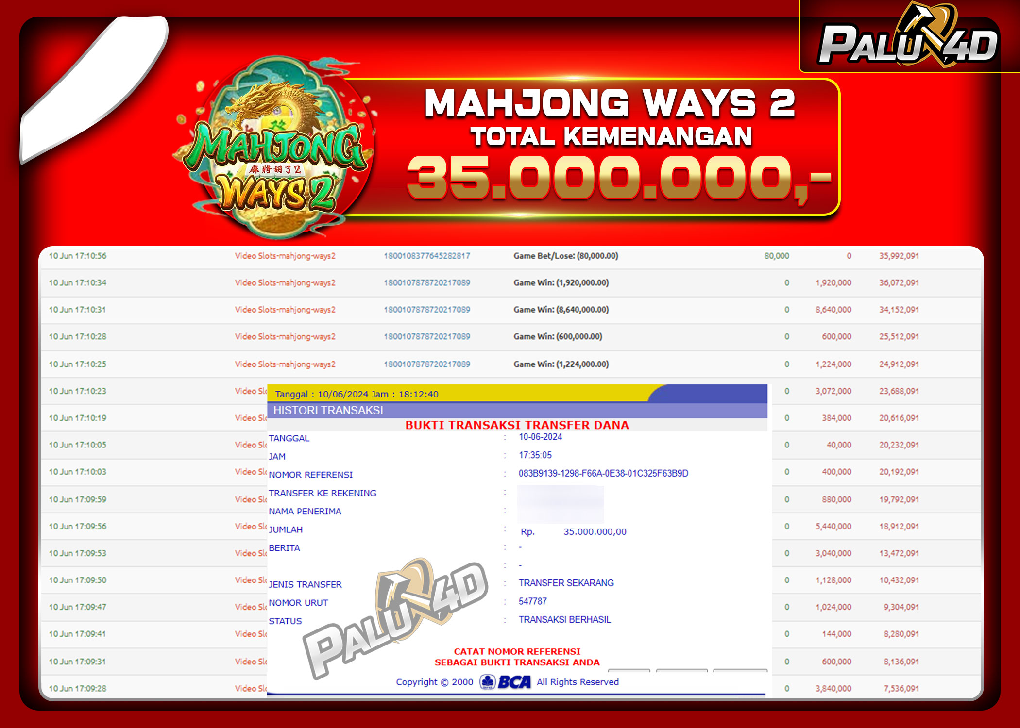 PALU4D – Selamat bagi pemenang yang mendapatkan jackpot hari ini 10 Juni 2024 di game Slot MAHJONG WAYS yang di sediakan situs palu4d dan sudah kami bayar lunas. Berikut data pemenang hari ini yang kami proses dengan cepat ke rekening tujuan yang terdaftar di akun selama ±10 menit.