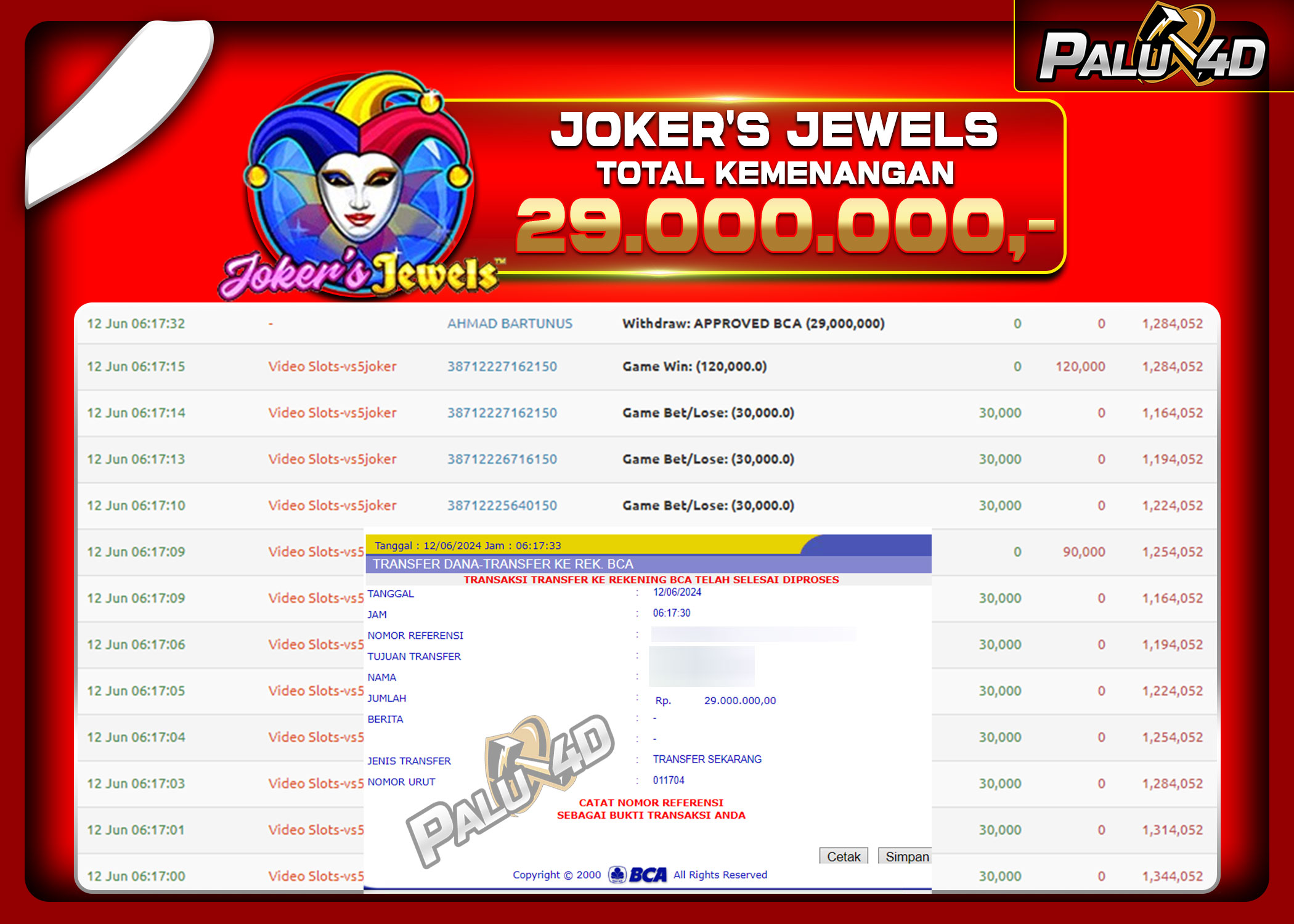 PALU4D – Selamat bagi pemenang yang mendapatkan jackpot hari ini 12 Juni 2024 di game Slot JOKER JEWELS yang di sediakan situs palu4d dan sudah kami bayar lunas. Berikut data pemenang hari ini yang kami proses dengan cepat ke rekening tujuan yang terdaftar di akun selama ±10 menit.
