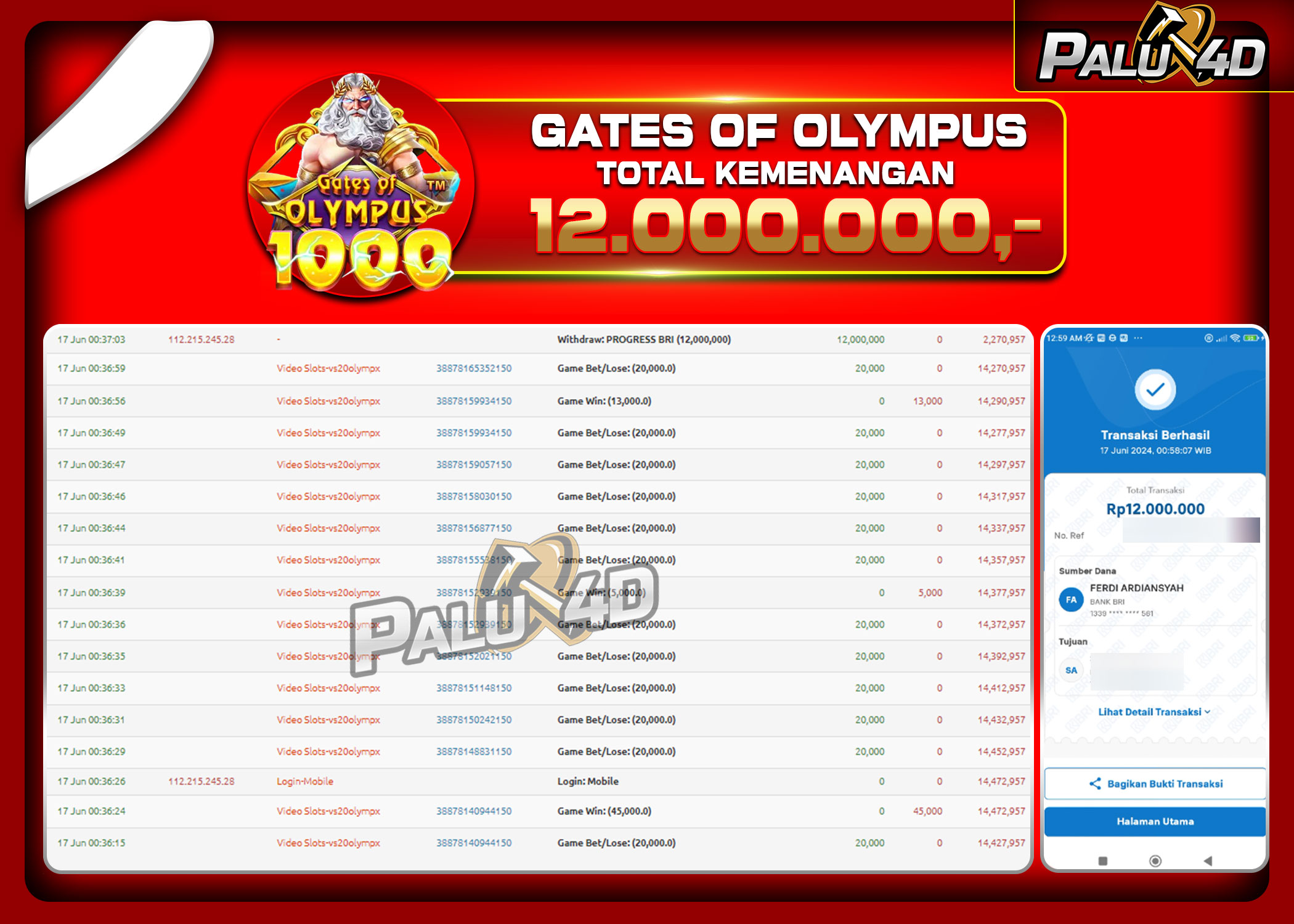 PALU4D – Selamat bagi pemenang yang mendapatkan jackpot hari ini 17 Juni 2024 di game Slot GATES OF OLYMPUS yang di sediakan situs palu4d dan sudah kami bayar lunas. Berikut data pemenang hari ini yang kami proses dengan cepat ke rekening tujuan yang terdaftar di akun selama ±10 menit.