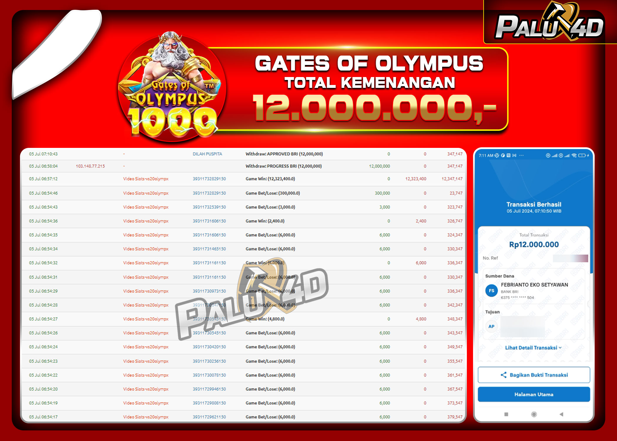 PALU4D – Selamat bagi pemenang yang mendapatkan jackpot hari ini 5 July 2024 di game Slot GATES OF OLYMPUS yang di sediakan situs palu4d dan sudah kami bayar lunas. Berikut data pemenang hari ini yang kami proses dengan cepat ke rekening tujuan yang terdaftar di akun selama ±10 menit.