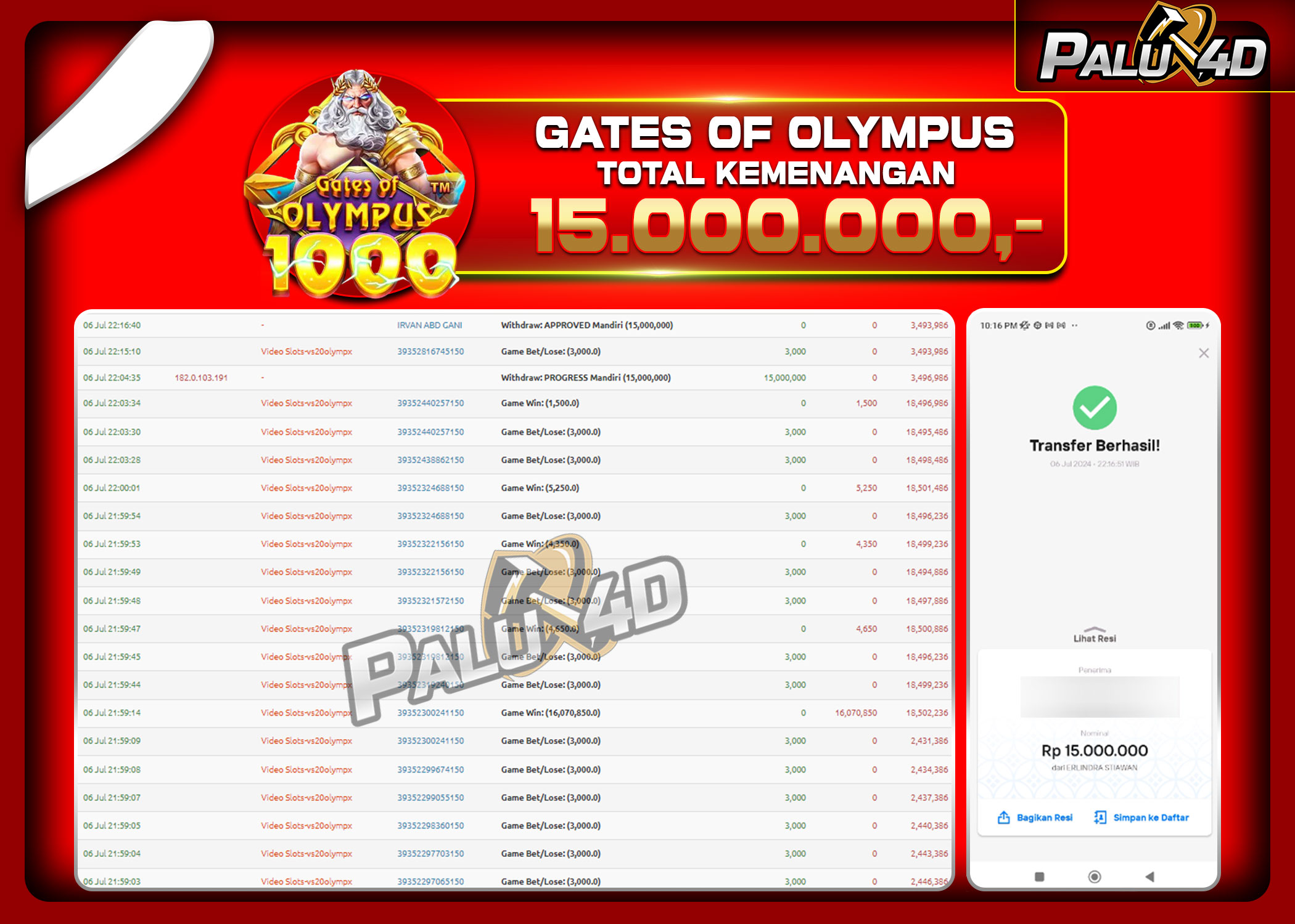 PALU4D – Selamat bagi pemenang yang mendapatkan jackpot hari ini 6 July 2024 di game Slot GATES OF OLYMPUS  yang di sediakan situs palu4d dan sudah kami bayar lunas. Berikut data pemenang hari ini yang kami proses dengan cepat ke rekening tujuan yang terdaftar di akun selama ±10 menit.