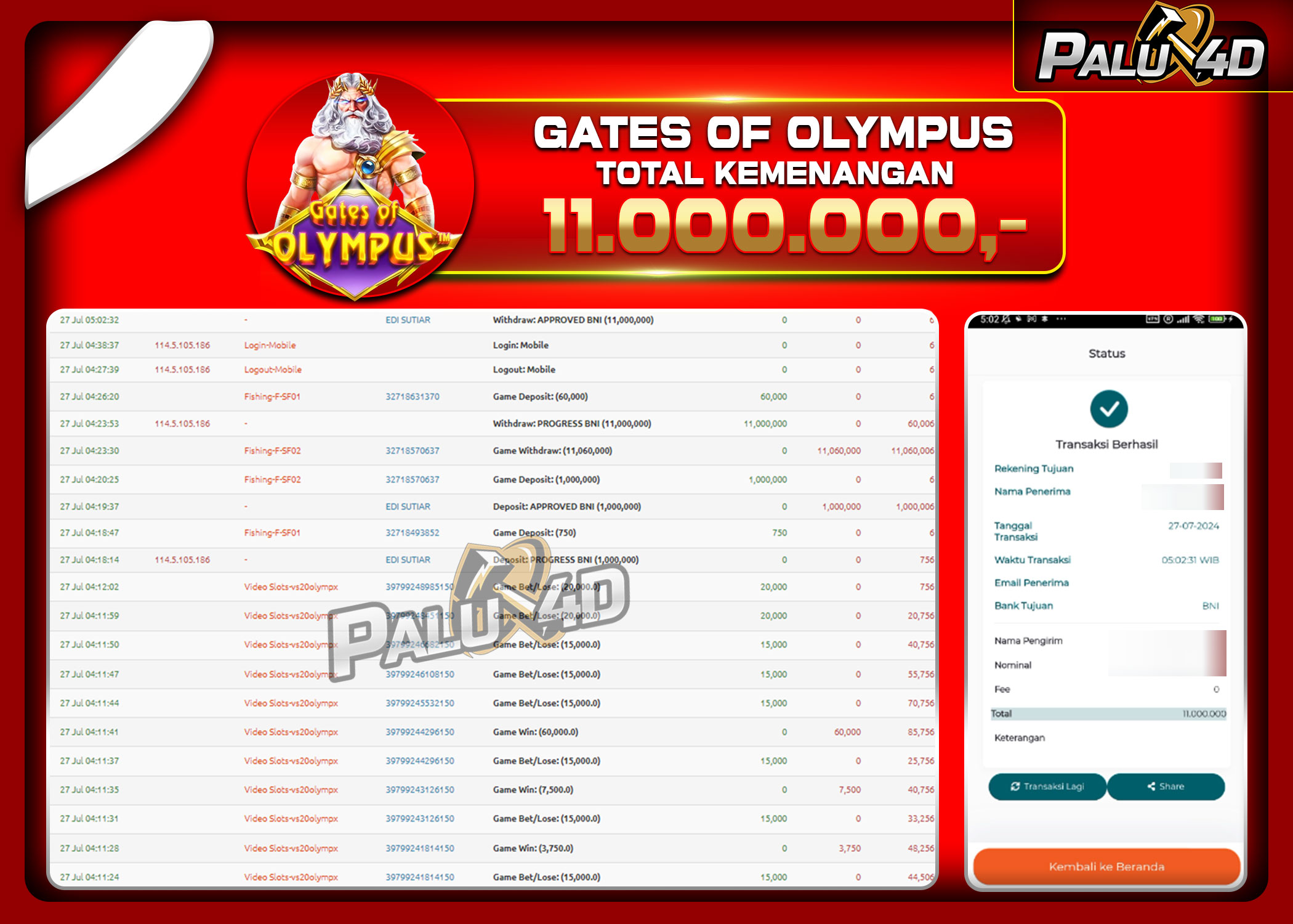 PALU4D – Selamat bagi pemenang yang mendapatkan jackpot hari ini 27 July 2024 di game Slot GATES OF OLYMPUS yang di sediakan situs palu4d dan sudah kami bayar lunas. Berikut data pemenang hari ini yang kami proses dengan cepat ke rekening tujuan yang terdaftar di akun selama ±10 menit.