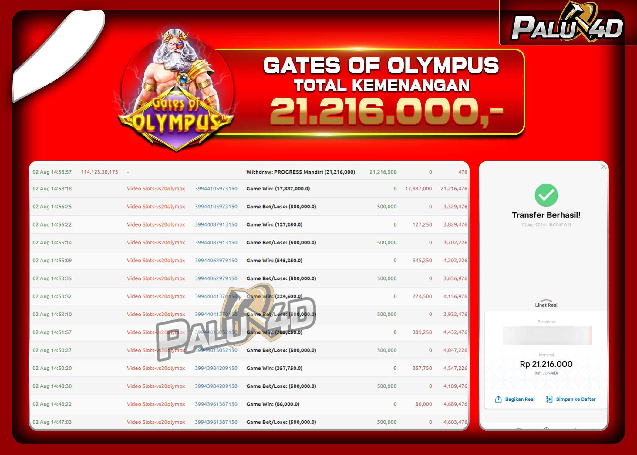 PALU4D – Selamat bagi pemenang yang mendapatkan jackpot hari ini 2 Agustus 2024 di game Slot GATES OF OLYMPUS yang di sediakan situs palu4d dan sudah kami bayar lunas. Berikut data pemenang hari ini yang kami proses dengan cepat ke rekening tujuan yang terdaftar di akun selama ±10 menit.