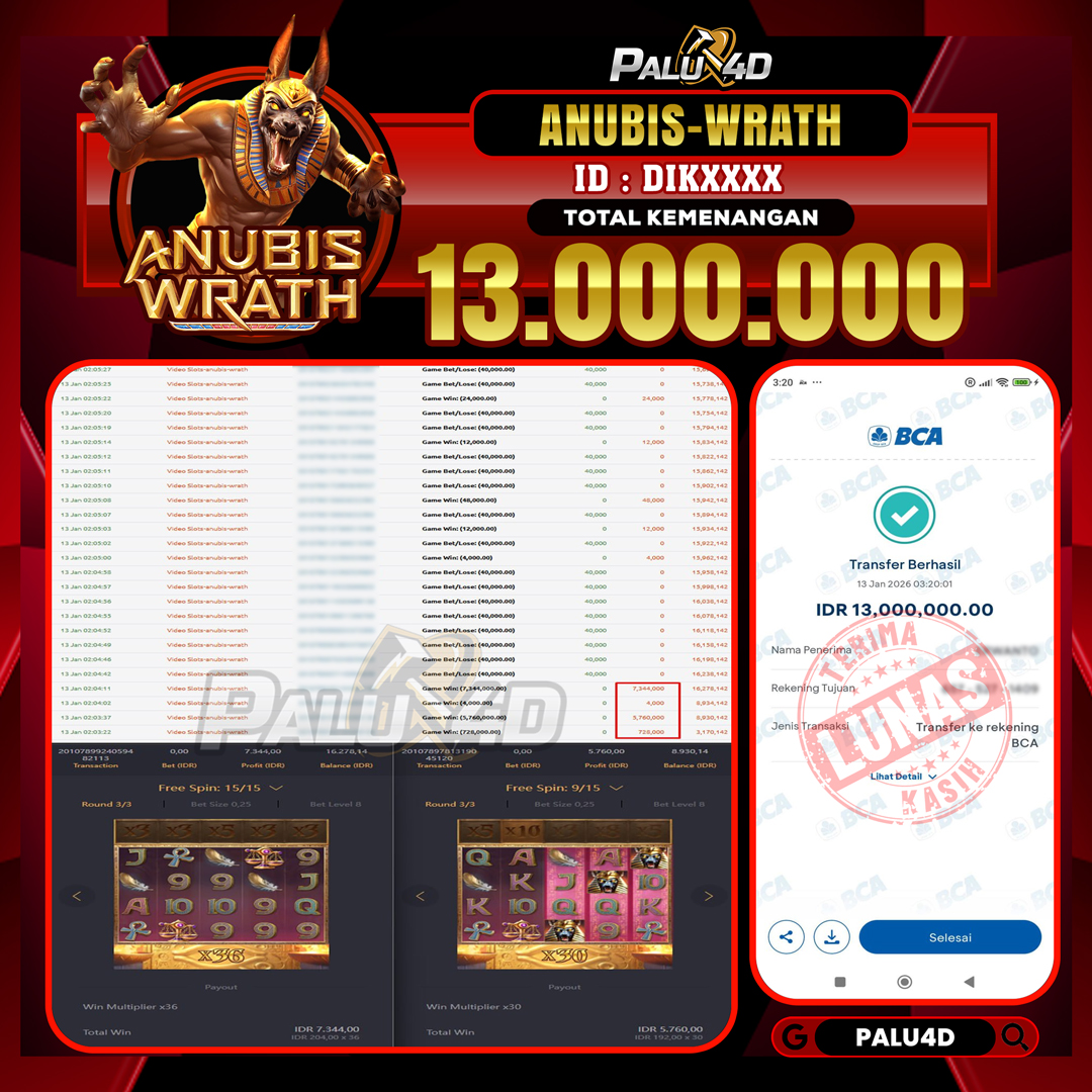PALU4D – Selamat bagi pemenang yang mendapatkan jackpot hari ini 13 JANUARI 2026 di game Slot ANUBIS WRATH yang di sediakan situs palu4d dan sudah kami bayar lunas. Berikut data pemenang hari ini yang kami proses dengan cepat ke rekening tujuan yang terdaftar di akun selama ±10 menit.