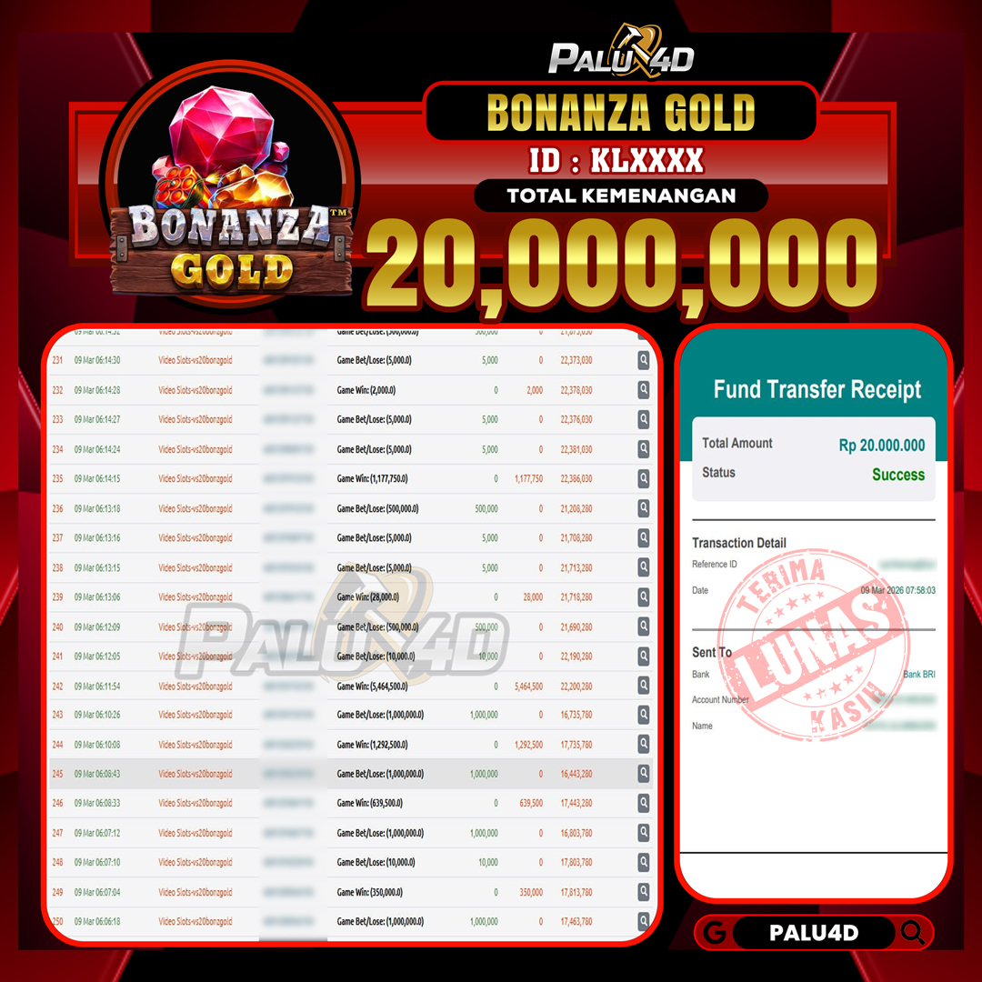 PALU4D – Menang Slot BONANZA GOLD Rp.20.000.000.,- LUNAS