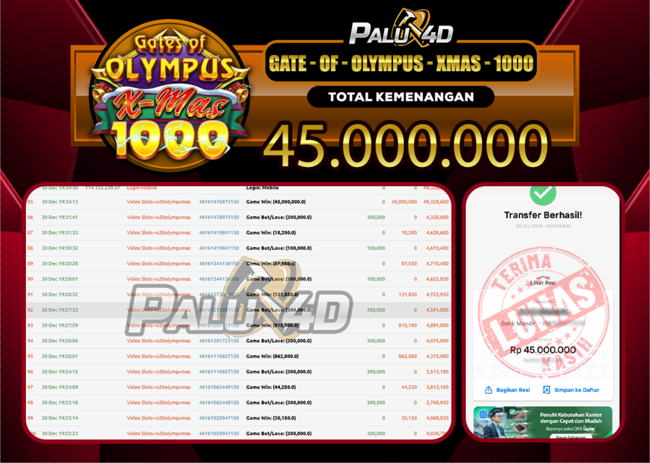 PALU4D – Selamat bagi pemenang yang mendapatkan jackpot hari ini 30 Desember 2024 di game Slot GATE OF OLYMPUS yang di sediakan situs palu4d dan sudah kami bayar lunas. Berikut data pemenang hari ini yang kami proses dengan cepat ke rekening tujuan yang terdaftar di akun selama ±10 menit.