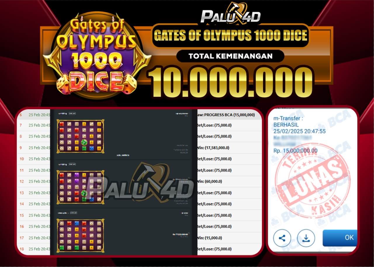PALU4D – Selamat bagi pemenang yang mendapatkan jackpot hari ini 25 February 2025 di game Slot GATE OF OLYMPUS DICE yang di sediakan situs palu4d dan sudah kami bayar lunas. Berikut data pemenang hari ini yang kami proses dengan cepat ke rekening tujuan yang terdaftar di akun selama ±10 menit.