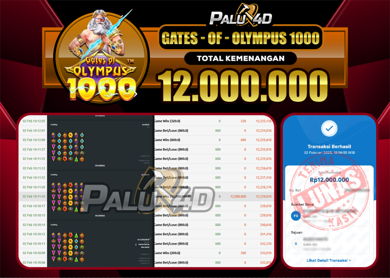 PALU4D – Selamat bagi pemenang yang mendapatkan jackpot hari ini 02 February 2025 di game Slot GATE OF OLYMPUS yang di sediakan situs palu4d dan sudah kami bayar lunas. Berikut data pemenang hari ini yang kami proses dengan cepat ke rekening tujuan yang terdaftar di akun selama ±10 menit.