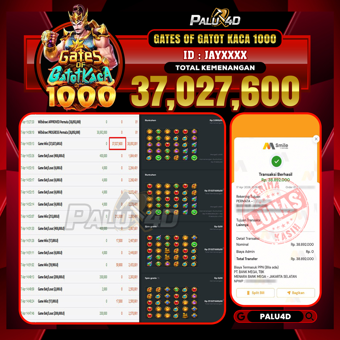 PALU4D – Selamat bagi pemenang yang mendapatkan jackpot hari ini 17 APRIL 2026 di game Slot GATES OF GATOTKACA 1000 yang di sediakan situs palu4d dan sudah kami bayar lunas. Berikut data pemenang hari ini yang kami proses dengan cepat ke rekening tujuan yang terdaftar di akun selama ±10 menit.