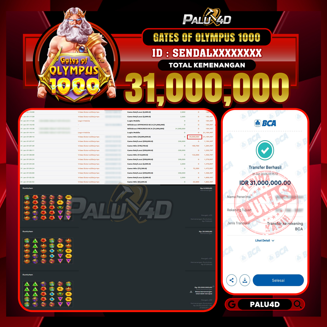 PALU4D – Selamat bagi pemenang yang mendapatkan jackpot hari ini 31 JANUARI 2026 di game Slot GATES OF OLYMPUS 1000 yang di sediakan situs palu4d dan sudah kami bayar lunas. Berikut data pemenang hari ini yang kami proses dengan cepat ke rekening tujuan yang terdaftar di akun selama ±10 menit.