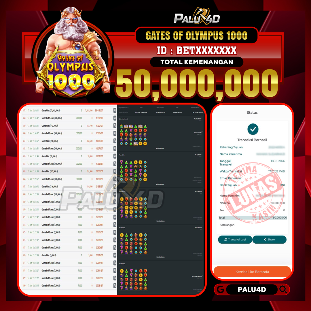 PALU4D – Selamat bagi pemenang yang mendapatkan jackpot hari ini 19 JANUARI 2026 di game Slot GATES OF OLYMPUS 1000 yang di sediakan situs palu4d dan sudah kami bayar lunas. Berikut data pemenang hari ini yang kami proses dengan cepat ke rekening tujuan yang terdaftar di akun selama ±10 menit.