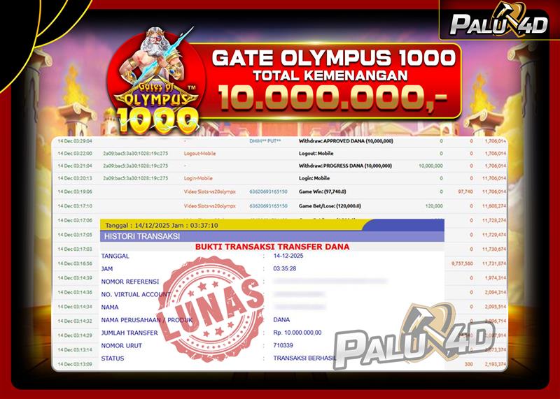 PALU4D – Selamat bagi pemenang yang mendapatkan jackpot hari ini 14 DESEMBER 2025 di game Slot GATES OF OLYMPUS 1000 yang di sediakan situs palu4d dan sudah kami bayar lunas. Berikut data pemenang hari ini yang kami proses dengan cepat ke rekening tujuan yang terdaftar di akun selama ±10 menit.