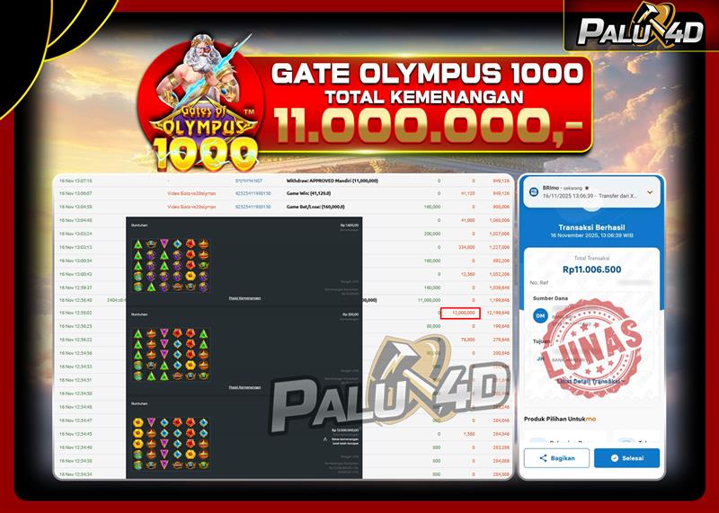 PALU4D – Selamat bagi pemenang yang mendapatkan jackpot hari ini 16 NOVEMBER 2025 di game Slot GATES OF OLYMPUS 1000  yang di sediakan situs palu4d dan sudah kami bayar lunas. Berikut data pemenang hari ini yang kami proses dengan cepat ke rekening tujuan yang terdaftar di akun selama ±10 menit.