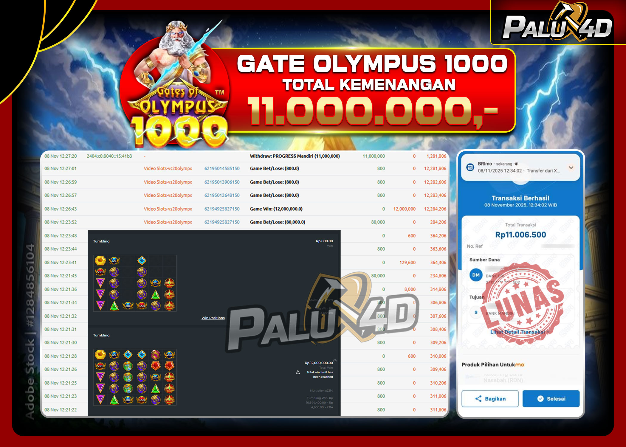 PALU4D – Selamat bagi pemenang yang mendapatkan jackpot hari ini 08 NOVEMBER 2025 di game Slot GATES OF OLYMPUS 1000 yang di sediakan situs palu4d dan sudah kami bayar lunas. Berikut data pemenang hari ini yang kami proses dengan cepat ke rekening tujuan yang terdaftar di akun selama ±10 menit.