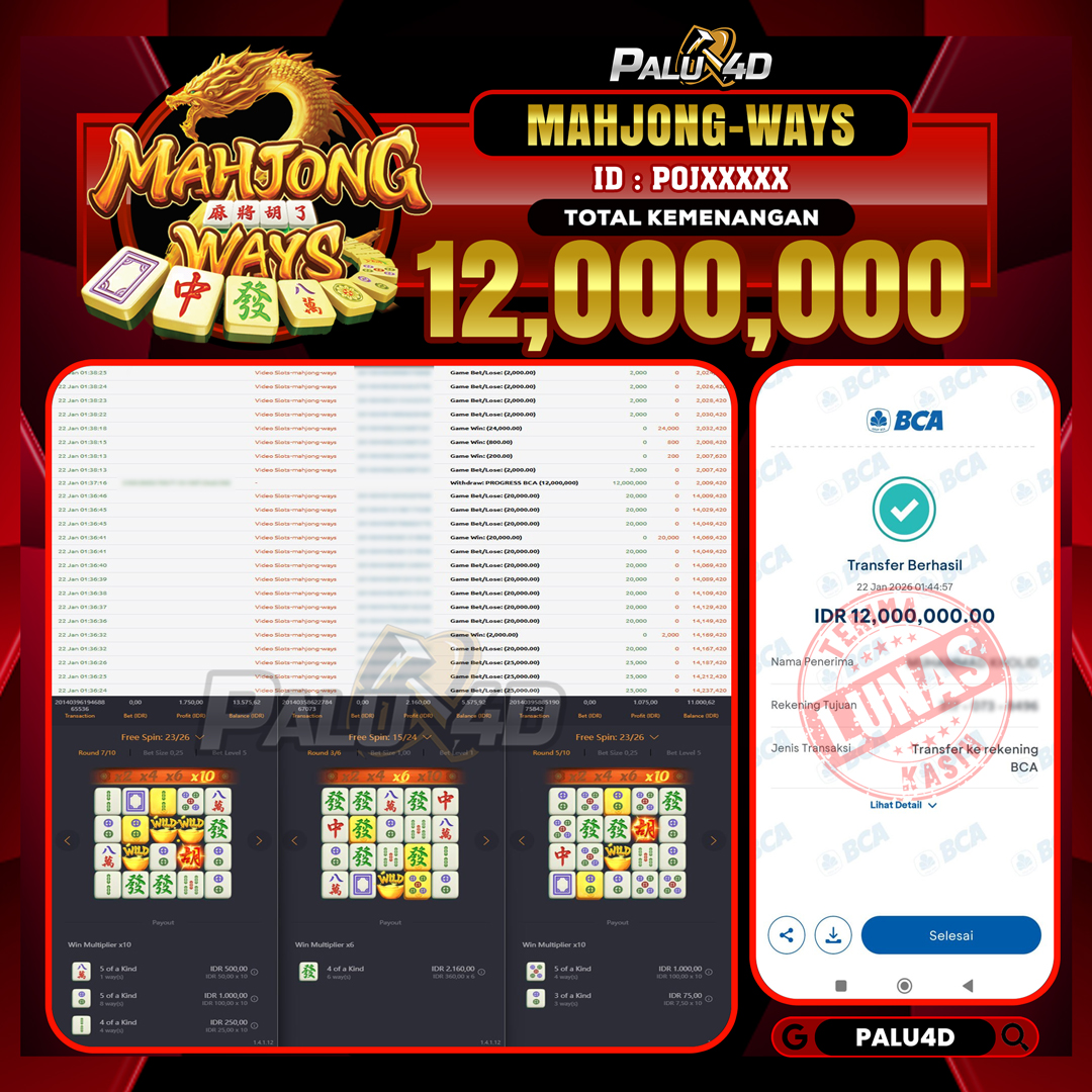 PALU4D – Selamat bagi pemenang yang mendapatkan jackpot hari ini 22 JANUARI 2026 di game Slot MAHJONG WAYS yang di sediakan situs palu4d dan sudah kami bayar lunas. Berikut data pemenang hari ini yang kami proses dengan cepat ke rekening tujuan yang terdaftar di akun selama ±10 menit.