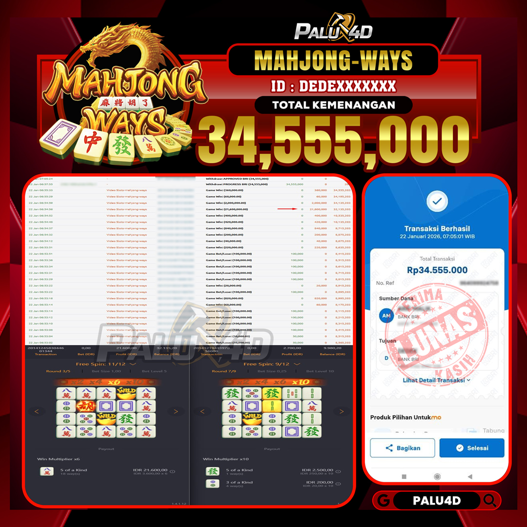 PALU4D – Selamat bagi pemenang yang mendapatkan jackpot hari ini 22 JANUARI 2026 di game Slot MAHJONG WAYS  yang di sediakan situs palu4d dan sudah kami bayar lunas. Berikut data pemenang hari ini yang kami proses dengan cepat ke rekening tujuan yang terdaftar di akun selama ±10 menit.