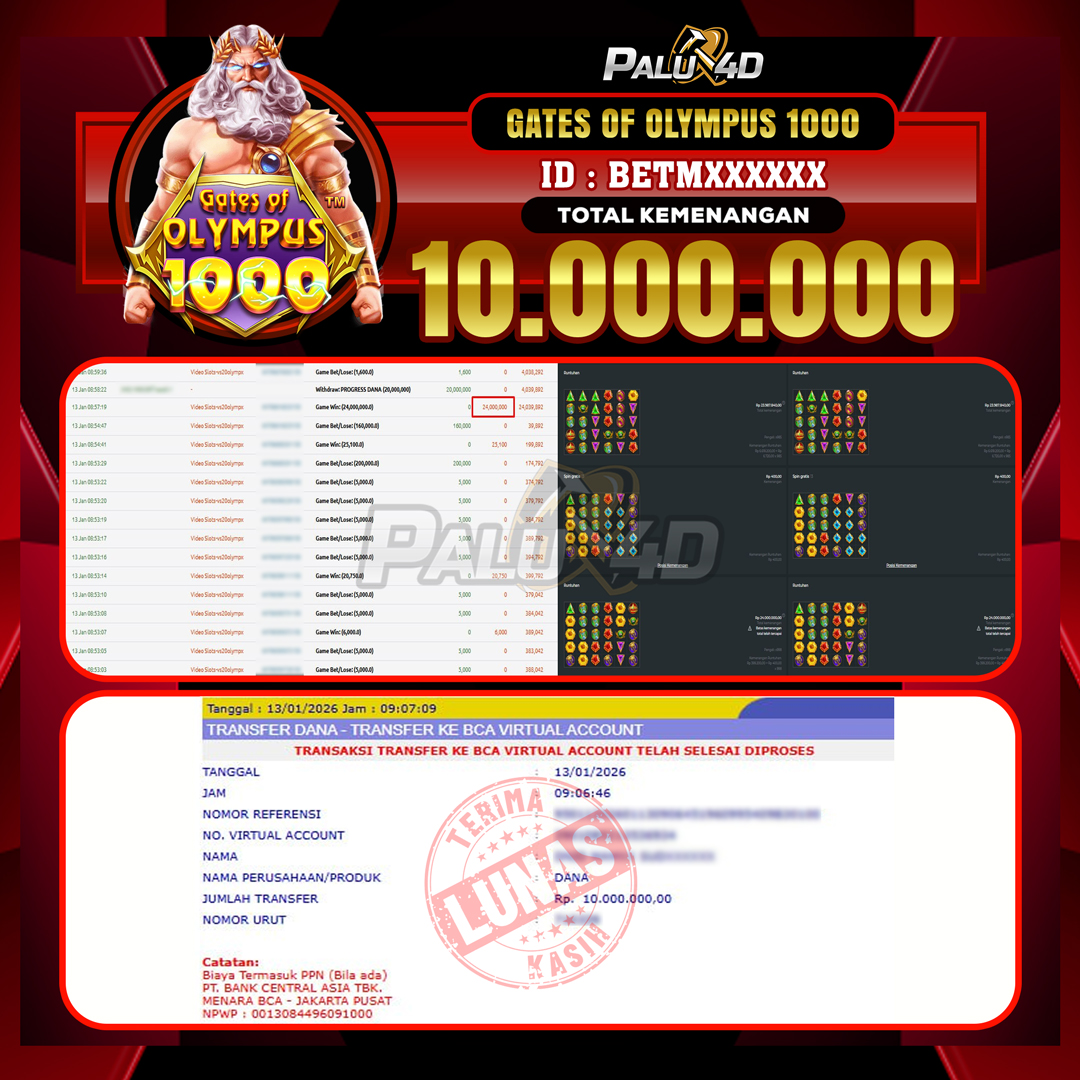 PALU4D – Selamat bagi pemenang yang mendapatkan jackpot hari ini 13 JANUARI 2026 di game Slot GATES OF OLYMPUS yang di sediakan situs palu4d dan sudah kami bayar lunas. Berikut data pemenang hari ini yang kami proses dengan cepat ke rekening tujuan yang terdaftar di akun selama ±10 menit.