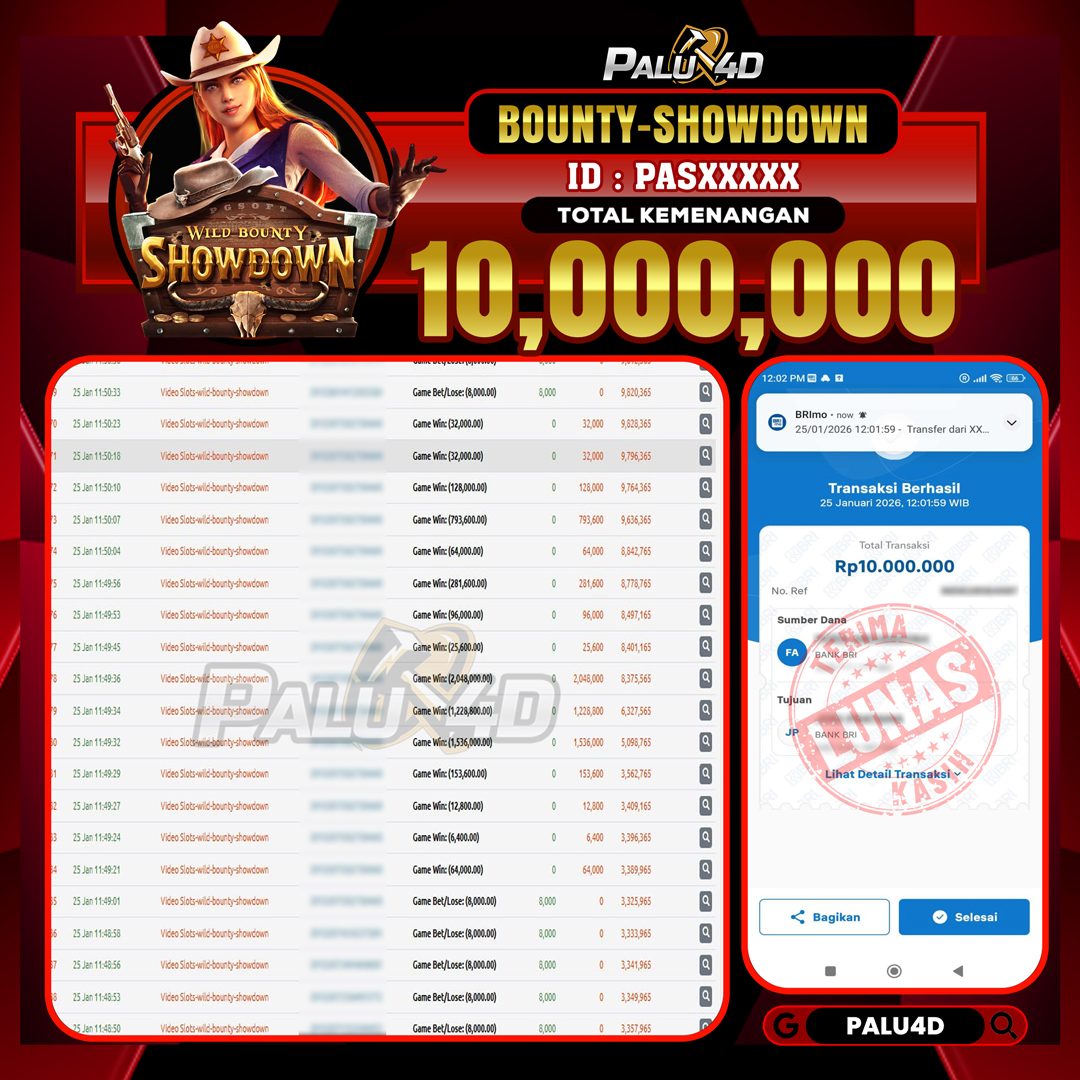 PALU4D – Selamat bagi pemenang yang mendapatkan jackpot hari ini 25 JANUARI 2026 di game Slot BOUNTY SHOWDOWN  yang di sediakan situs palu4d dan sudah kami bayar lunas. Berikut data pemenang hari ini yang kami proses dengan cepat ke rekening tujuan yang terdaftar di akun selama ±10 menit.