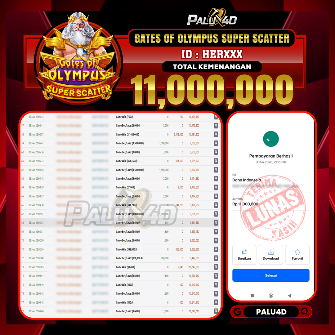 PALU4D – Selamat bagi pemenang yang mendapatkan jackpot hari ini 03 MARET 2026 di game Slot GATES OF OLYMPUS SUPER SCATTER yang di sediakan situs palu4d dan sudah kami bayar lunas. Berikut data pemenang hari ini yang kami proses dengan cepat ke rekening tujuan yang terdaftar di akun selama ±10 menit.