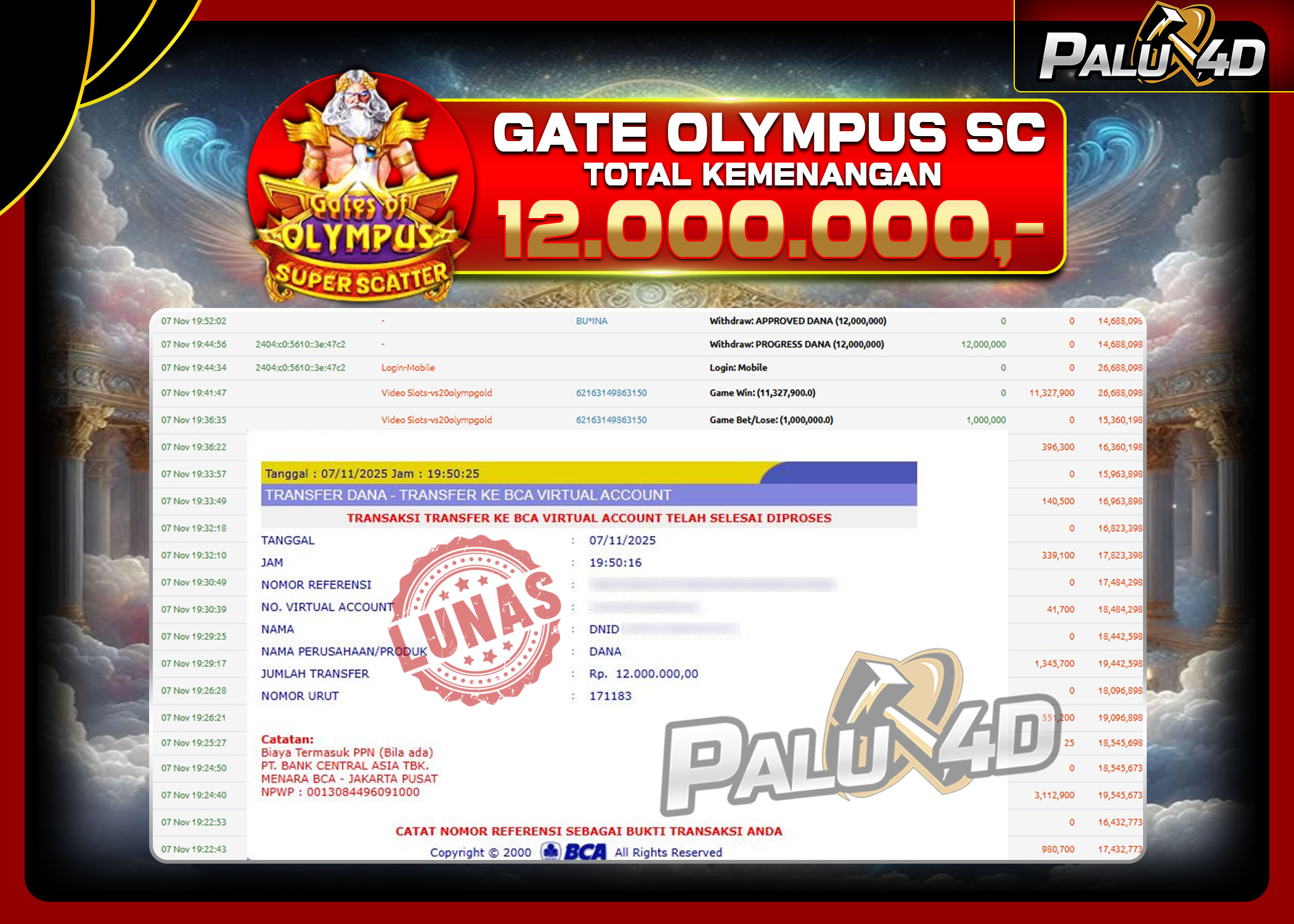 PALU4D – Selamat bagi pemenang yang mendapatkan jackpot hari ini 07 NOVEMBER 2025 di game Slot GATES OF OLYMPUS SUPER SCATTER yang di sediakan situs palu4d dan sudah kami bayar lunas. Berikut data pemenang hari ini yang kami proses dengan cepat ke rekening tujuan yang terdaftar di akun selama ±10 menit.
