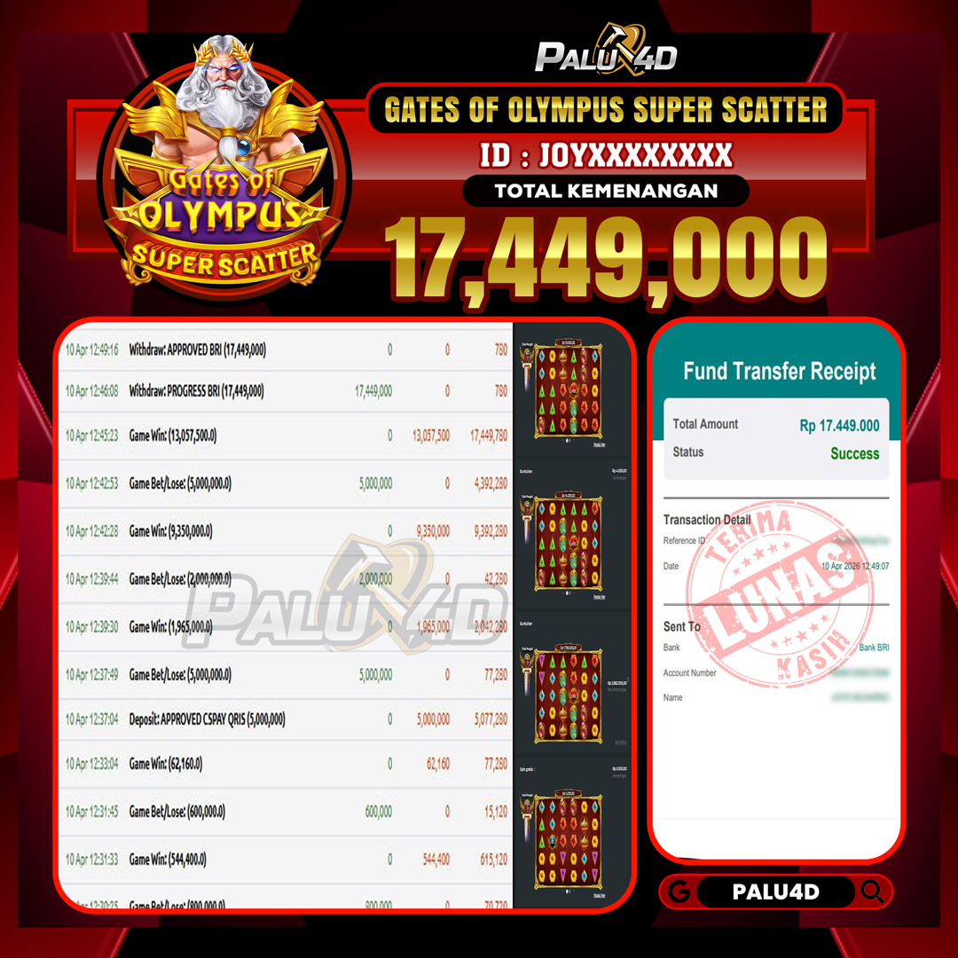 PALU4D – Selamat bagi pemenang yang mendapatkan jackpot hari ini 10 APRIL 2026 di game Slot GATES OF OLYMPUS SUPER SCATTER yang di sediakan situs palu4d dan sudah kami bayar lunas. Berikut data pemenang hari ini yang kami proses dengan cepat ke rekening tujuan yang terdaftar di akun selama ±10 menit.