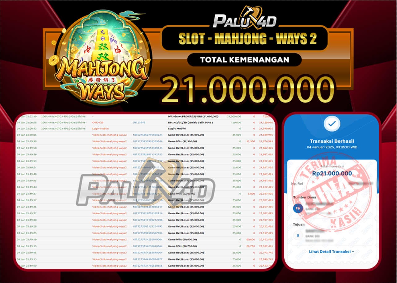 PALU4D – Menang Slot MAHJONG WAYS Rp.21.000.000.,- LUNAS