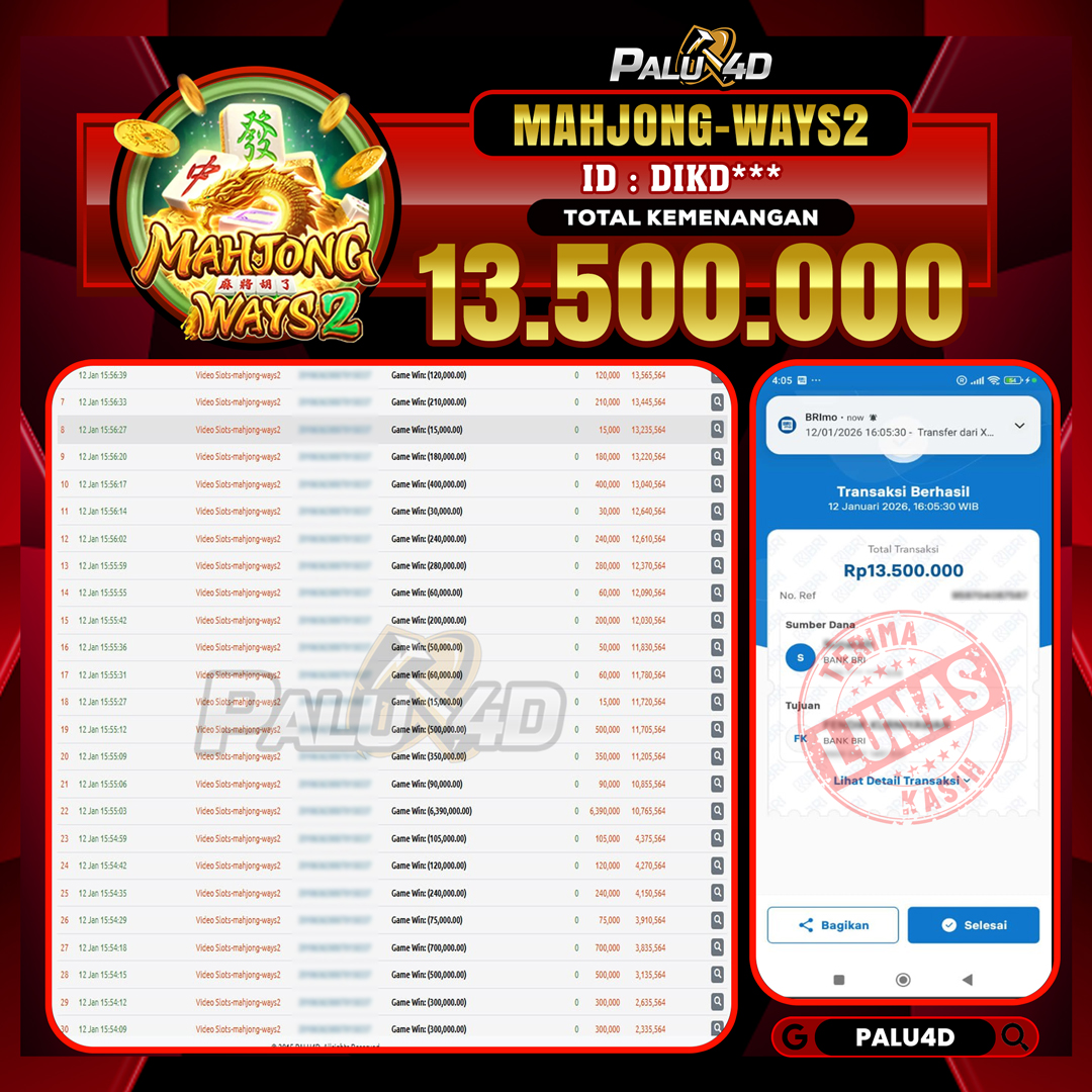 PALU4D – Selamat bagi pemenang yang mendapatkan jackpot hari ini 12 JANUARI 2026 di game Slot MAHJONG WAYS 2 yang di sediakan situs palu4d dan sudah kami bayar lunas. Berikut data pemenang hari ini yang kami proses dengan cepat ke rekening tujuan yang terdaftar di akun selama ±10 menit.