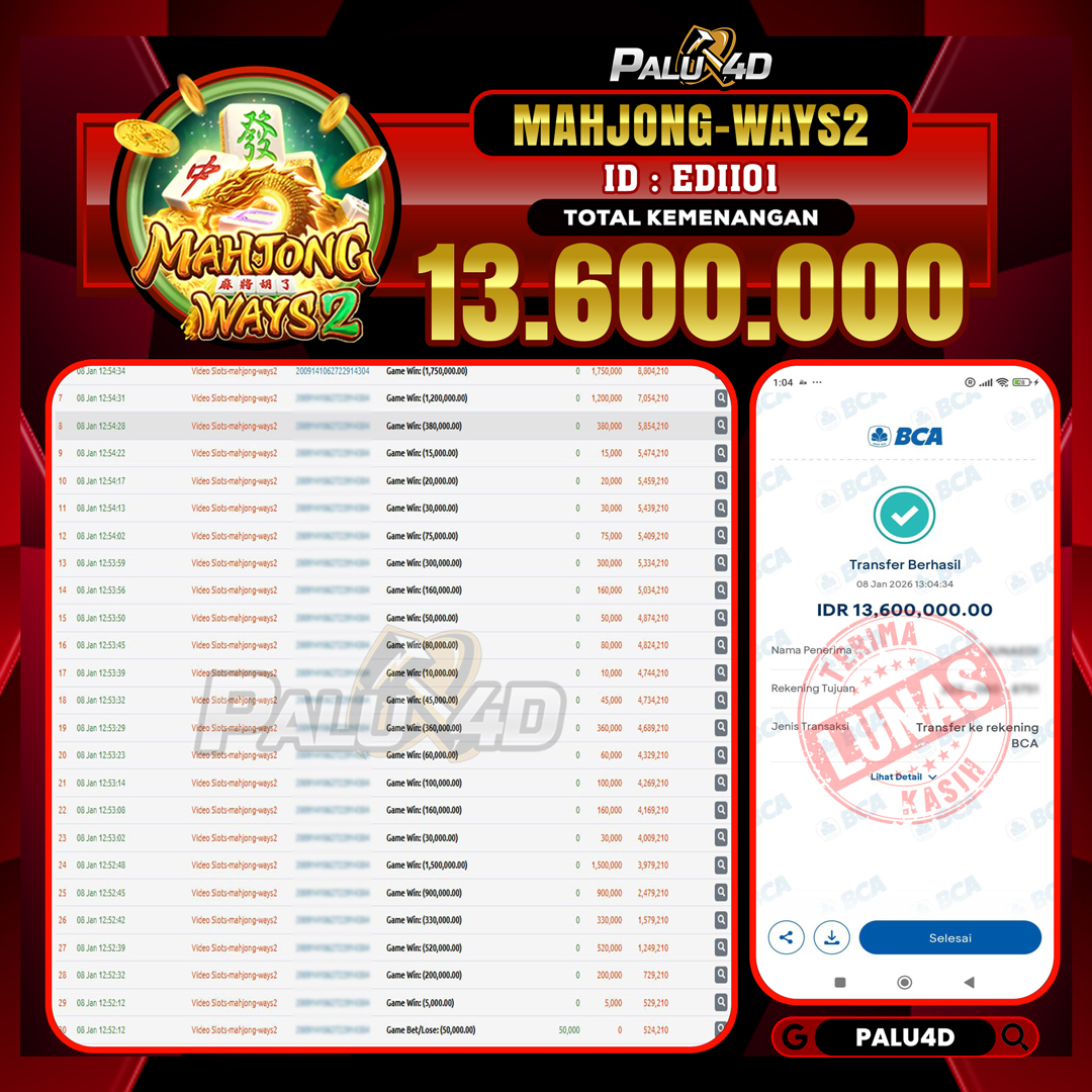 PALU4D – Selamat bagi pemenang yang mendapatkan jackpot hari ini 08 JANUARI 2026 di game Slot MAHJONG WAYS 2 yang di sediakan situs palu4d dan sudah kami bayar lunas. Berikut data pemenang hari ini yang kami proses dengan cepat ke rekening tujuan yang terdaftar di akun selama ±10 menit.
