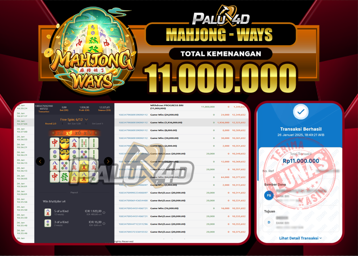 PALU4D – Selamat bagi pemenang yang mendapatkan jackpot hari ini 26 January 2025 di game Slot MAHJONG WAYS yang di sediakan situs palu4d dan sudah kami bayar lunas. Berikut data pemenang hari ini yang kami proses dengan cepat ke rekening tujuan yang terdaftar di akun selama ±10 menit.