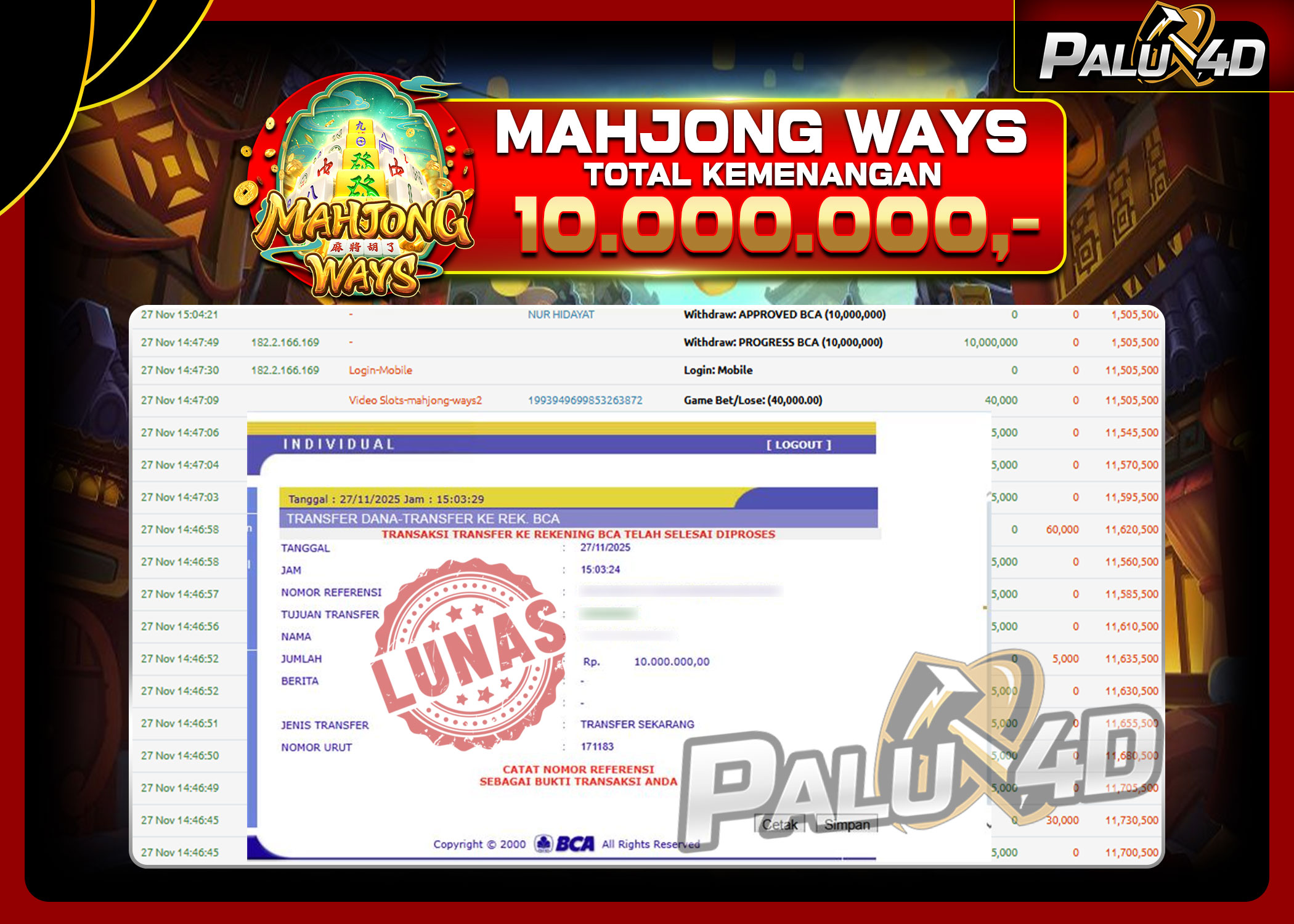 PALU4D – Selamat bagi pemenang yang mendapatkan jackpot hari ini 27 NOVEMBER 2025 di game Slot MAHJONG WAYS yang di sediakan situs palu4d dan sudah kami bayar lunas. Berikut data pemenang hari ini yang kami proses dengan cepat ke rekening tujuan yang terdaftar di akun selama ±10 menit.