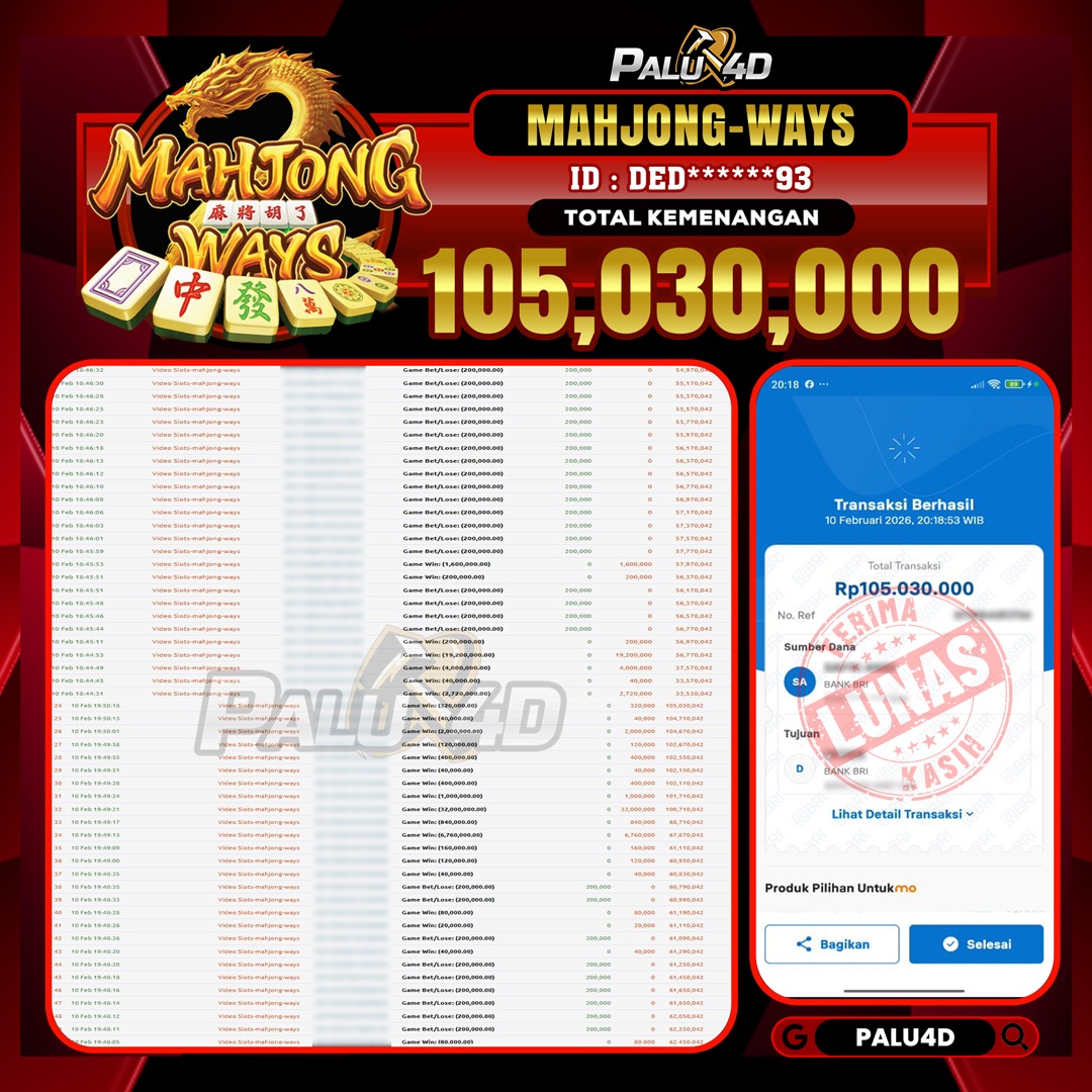 PALU4D – Selamat bagi pemenang yang mendapatkan jackpot hari ini 10 FEBRUARI 2026 di game Slot MAHJONG WAYS yang di sediakan situs palu4d dan sudah kami bayar lunas. Berikut data pemenang hari ini yang kami proses dengan cepat ke rekening tujuan yang terdaftar di akun selama ±10 menit.