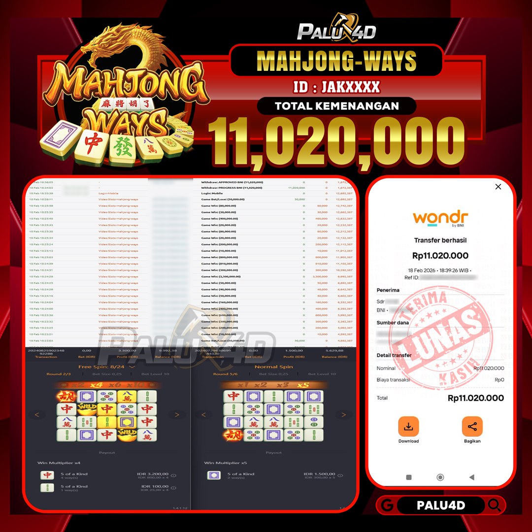 PALU4D – Selamat bagi pemenang yang mendapatkan jackpot hari ini 18 FEBRUARI 2026 di game Slot MAHJONG WAYS yang di sediakan situs palu4d dan sudah kami bayar lunas. Berikut data pemenang hari ini yang kami proses dengan cepat ke rekening tujuan yang terdaftar di akun selama ±10 menit.