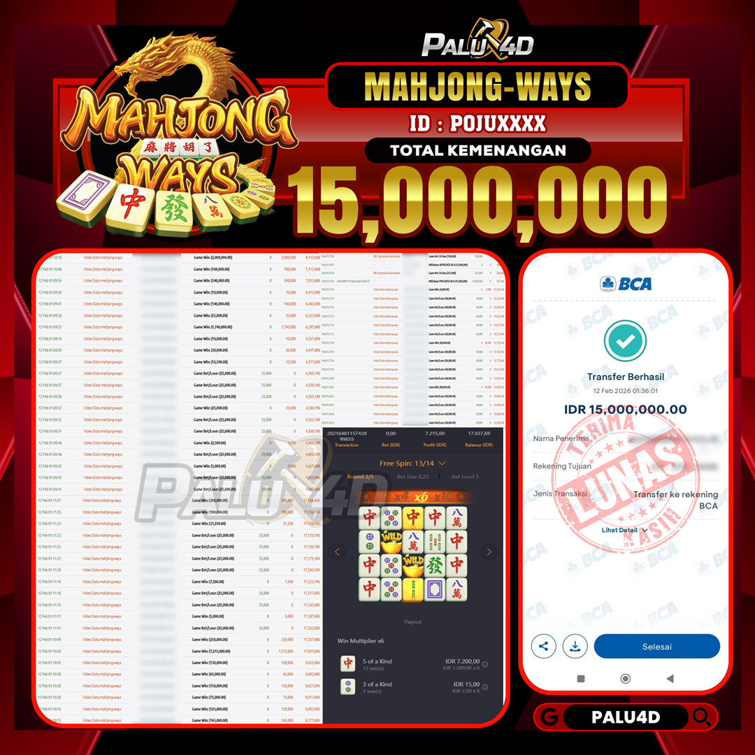 PALU4D – Selamat bagi pemenang yang mendapatkan jackpot hari ini 12 FEBRUARI 2026 di game Slot MAHJONG WAYS  yang di sediakan situs palu4d dan sudah kami bayar lunas. Berikut data pemenang hari ini yang kami proses dengan cepat ke rekening tujuan yang terdaftar di akun selama ±10 menit.
