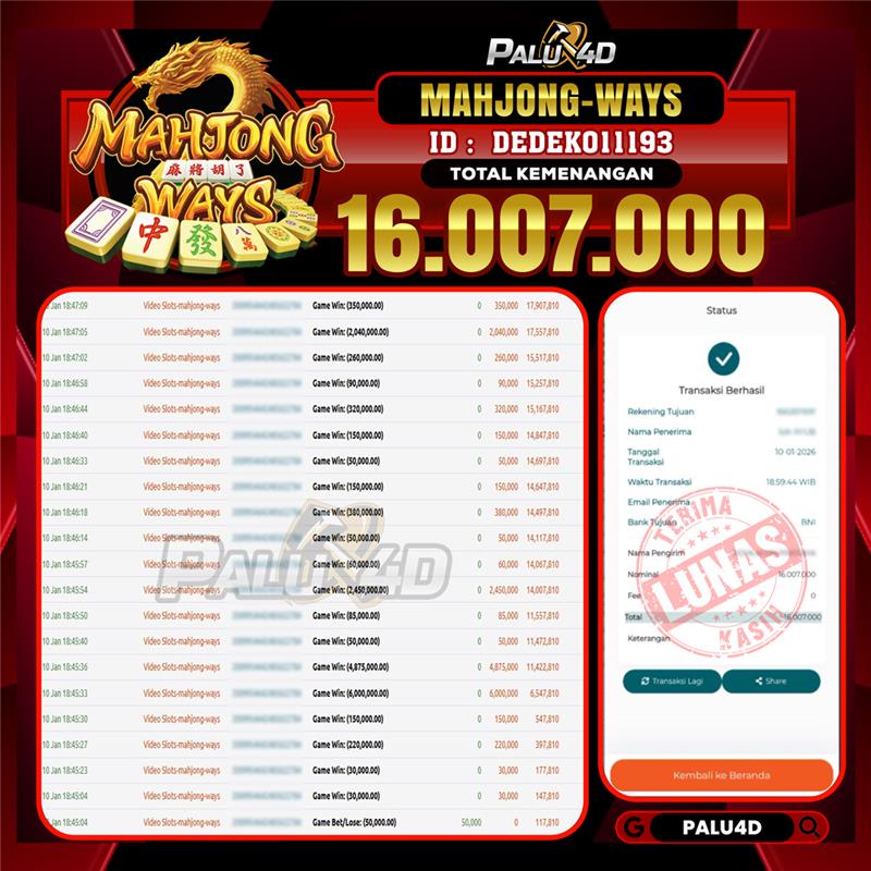PALU4D – Selamat bagi pemenang yang mendapatkan jackpot hari ini 10 JANUARI 2026 di game Slot MAHJONG WAYS yang di sediakan situs palu4d dan sudah kami bayar lunas. Berikut data pemenang hari ini yang kami proses dengan cepat ke rekening tujuan yang terdaftar di akun selama ±10 menit.