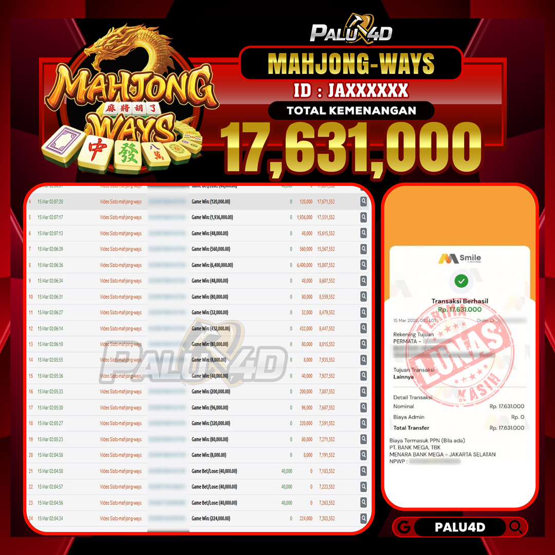 PALU4D – Selamat bagi pemenang yang mendapatkan jackpot hari ini 15 MARET 2026 di game Slot MAHJONG-WAYS yang di sediakan situs palu4d dan sudah kami bayar lunas. Berikut data pemenang hari ini yang kami proses dengan cepat ke rekening tujuan yang terdaftar di akun selama ±10 menit.