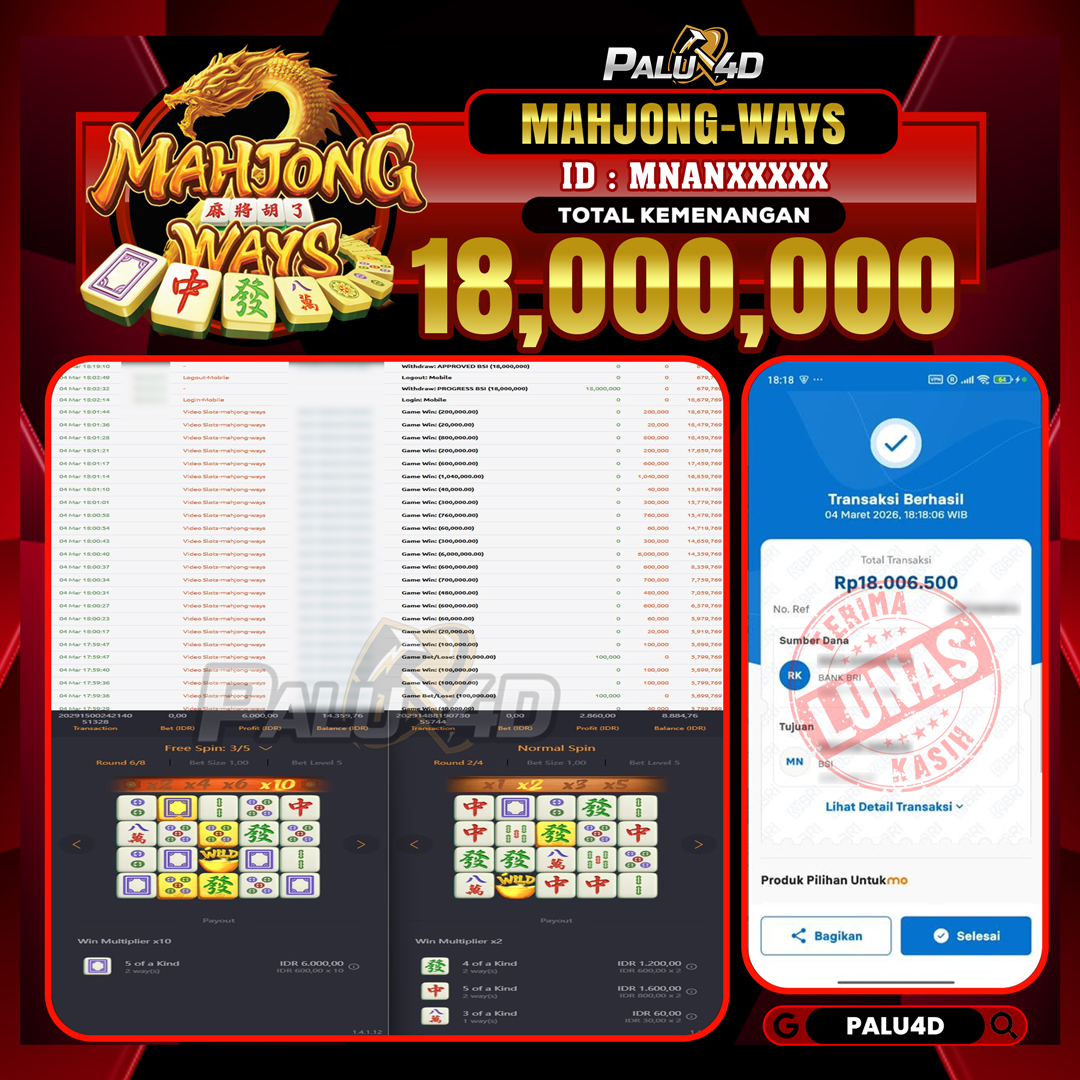 PALU4D – Selamat bagi pemenang yang mendapatkan jackpot hari ini 04 MARET 2026 di game Slot MAHJONG WAYS  yang di sediakan situs palu4d dan sudah kami bayar lunas. Berikut data pemenang hari ini yang kami proses dengan cepat ke rekening tujuan yang terdaftar di akun selama ±10 menit.