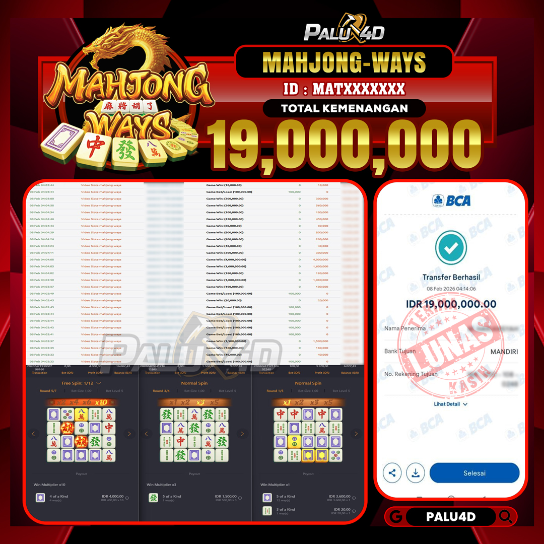 PALU4D – Selamat bagi pemenang yang mendapatkan jackpot hari ini 08 FEBRUARI 2026 di game Slot MAHJONG WAYS  yang di sediakan situs palu4d dan sudah kami bayar lunas. Berikut data pemenang hari ini yang kami proses dengan cepat ke rekening tujuan yang terdaftar di akun selama ±10 menit.