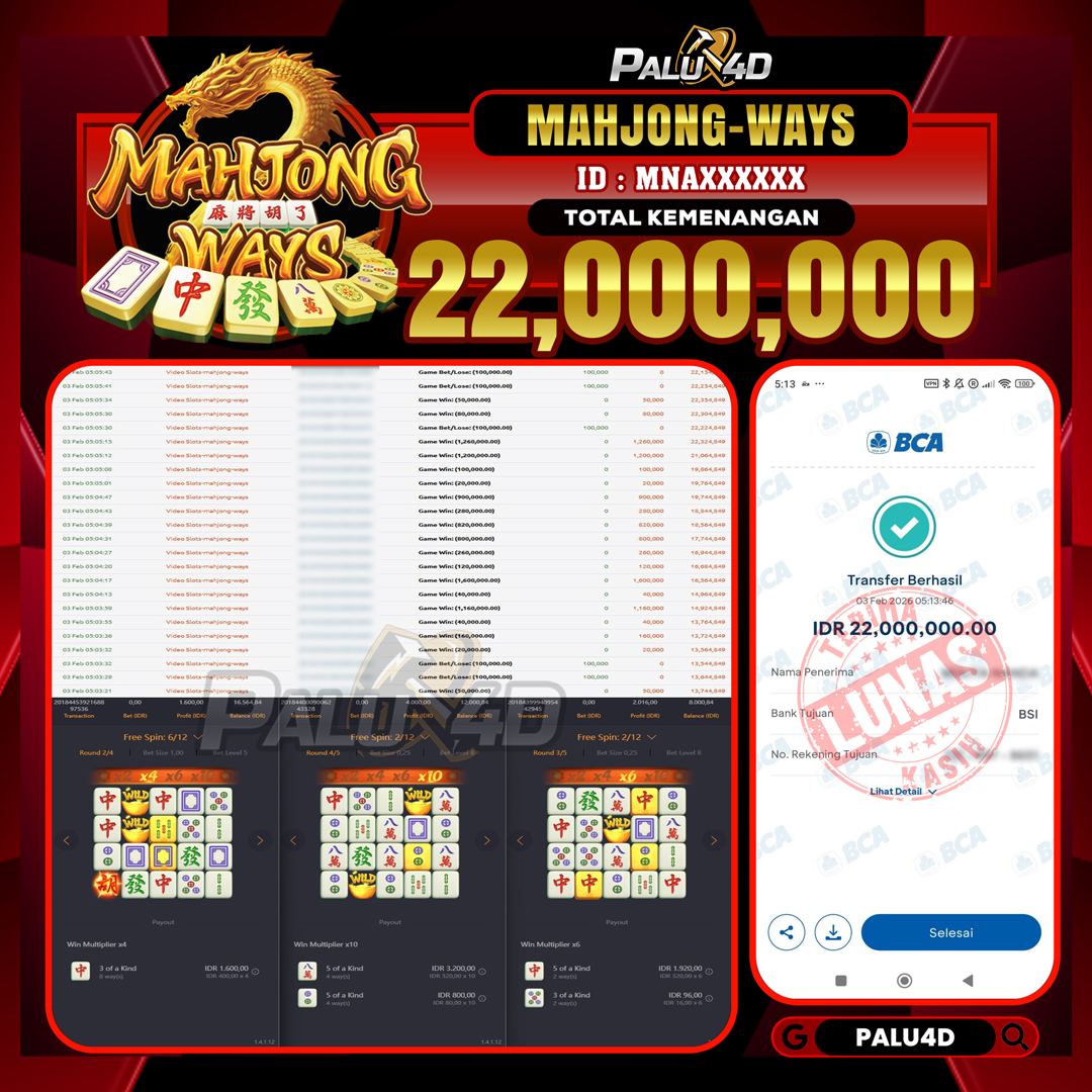 PALU4D – Selamat bagi pemenang yang mendapatkan jackpot hari ini 03 FEBRUARI 2026 di game Slot MAHJONG WAYS  yang di sediakan situs palu4d dan sudah kami bayar lunas. Berikut data pemenang hari ini yang kami proses dengan cepat ke rekening tujuan yang terdaftar di akun selama ±10 menit.