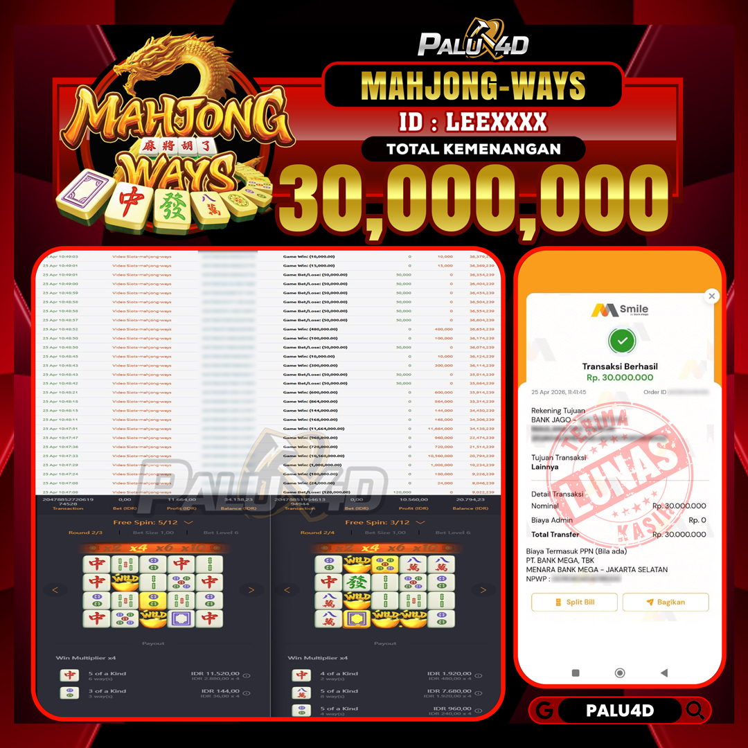 PALU4D – Menang Slot MAHJONG WAYS Rp.30.000.000.,- LUNAS