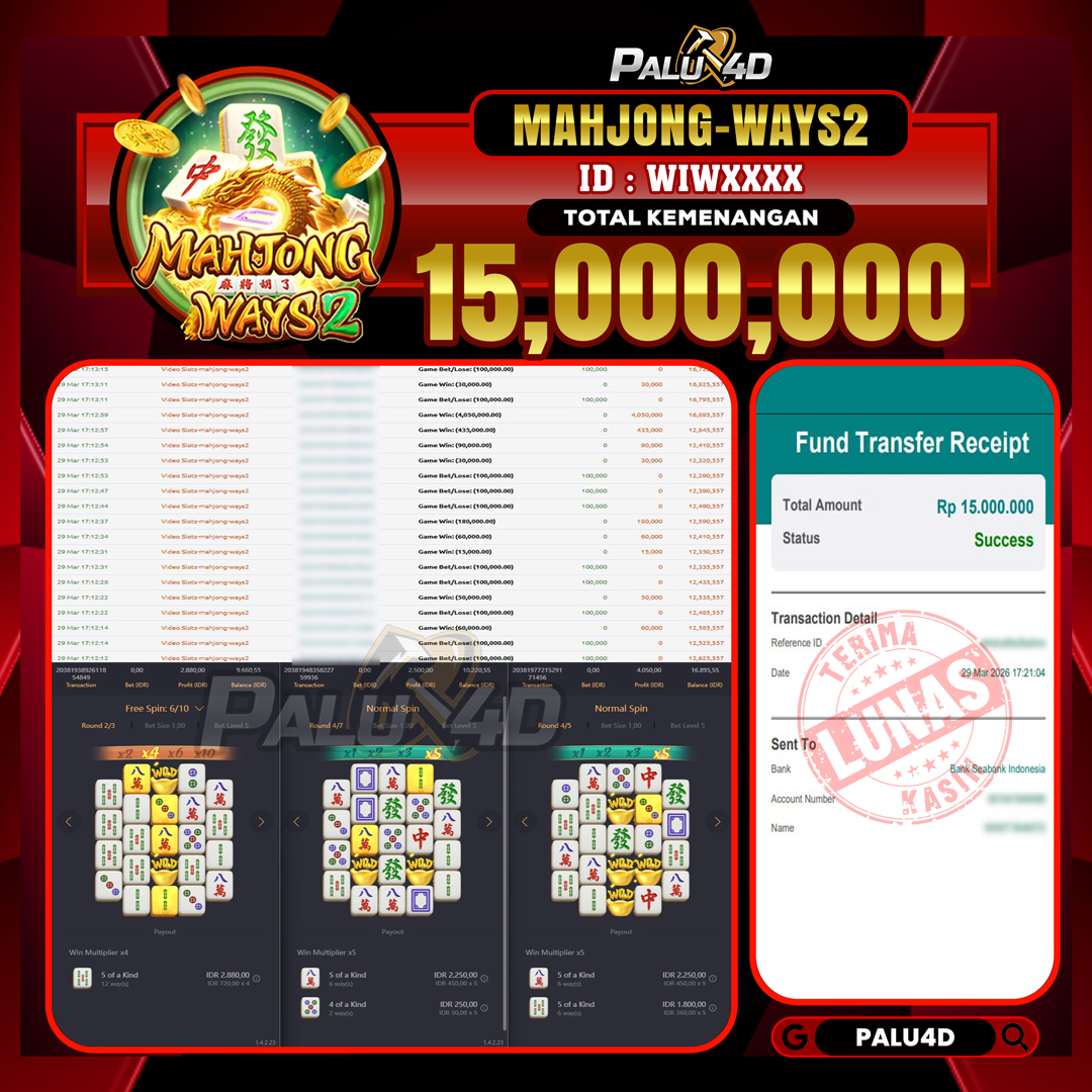 PALU4D – Selamat bagi pemenang yang mendapatkan jackpot hari ini 29 MARET 2026 di game Slot MAHJONG-WAYS2 yang di sediakan situs palu4d dan sudah kami bayar lunas. Berikut data pemenang hari ini yang kami proses dengan cepat ke rekening tujuan yang terdaftar di akun selama ±10 menit.